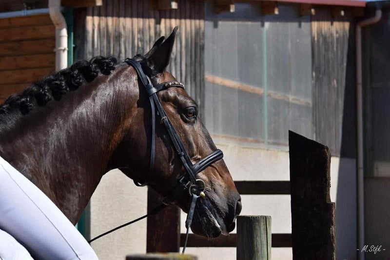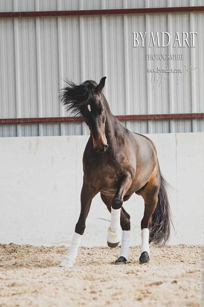 Nato nel 2012, questo splendido stallone di razza pura spagnola di 13 anni, di colore baio scuro, incarna sia l'eleganza classica che l'affidabilità di un vero cavallo del cuore. Con i suoi 1,66 m e la sua conformazione armoniosa, unisce carisma e sicurezza, un partner raro che affascina tanto per la sua presenza quanto per il suo temperamento. Padre: Brandy TG – rinomato per trasmettere eleganza, equilibrio e ampiezza. Padre della madre: Jamonero VII – un stallone PRE di riferimento, apprezzato per la forza e la solidità della sua progenie. Queste origini gli conferiscono una locomozione pura e regolare, senza difetti: non scarta, non trotta con le ginocchia, e mantiene andature morbide, cadenzate ed eleganti. Educato con serietà, possiede una buona base di scuola e ora si avvicina alla alta scuola: Cambi di piede isolati in fase di consolidamento, Piaffer, passaggio e pirouette in costruzione, Sempre lavorato con un semplice filetto. Montato sia da un professionista che da un amatore, ha già partecipato in Amateur 2 con ottimi punteggi, confermando la sua serietà e regolarità in pista. Molto connesso all'uomo, si distingue per il suo sguardo espressivo e la sua personalità affascinante. Vicino al suo cavaliere, ama tanto il lavoro sotto sella quanto il lavoro a terra e in libertà: mobilitazione delle anche e delle spalle, richiamo, aspirazione, passo spagnolo, valzer… Adora questi momenti di complicità che rafforzano il legame. All'esterno, va in passeggiata da solo o in compagnia, sempre calmo e sereno. Facile da curare, viaggia bene e apprezza uno stile di vita confortevole: box con uscite in paddock o riparo. La sua salute è seguita regolarmente da veterinario, osteopata e maniscalco. Radiografie disponibili (qualche osservazione, ma schiena impeccabile). Questo cavallo non è adatto a tutti: è destinato a un cavaliere esperto, capace di accompagnarlo e apprezzare il suo potenziale così come la sua sensibilità. Per chi saprà offrirgli una vera relazione, diventerà un partner unico, tanto piacevole nel lavoro quanto toccante nella vita quotidiana.