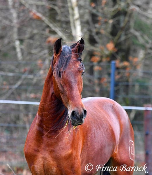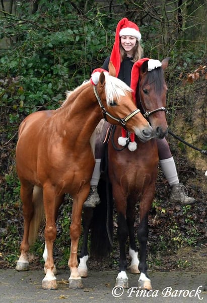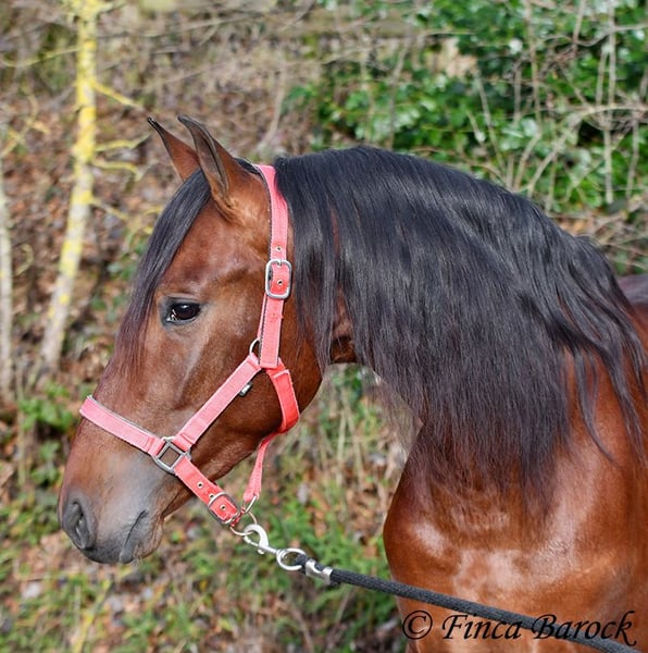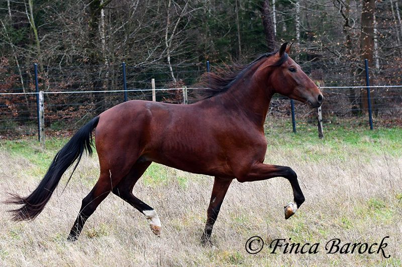 Rasse: PRE Name: Bandolero Geschlecht: Wallach Stockmaß: 161 cm Alter: 01.04.2022 Farbe: Braun Preis: 5500 € Vater: Bandolero CXXIII v. Jilguero XII Mutter: Manzanilla XL v. Volador XIII Bandolero, super schicker, bewegungsstarker Schmusebär der mit seiner freundlichen Art sofort alle um seine Hufe wickelt! Bandolero ist leicht in den GGA angeritten und ein echter Musterschüler. Insgesamt hat er eine tolle Grundcoolness, womit das Arbeiten mit ihm noch mehr Spaß macht. Neuen Sachen steht er total offen gegenüber und freut sich über Abwechslung. Reiten ohne Sattel - ja klar. Über eine Plane gehen, Hunde die mitlaufen, Traktoren welche vorbeifahren - Bandolero möchte dabei sein. Auch erste Ausritte hat er super gemeistert und zeigt sich bei "gruseligen" eher neugierig und möchte die Sachen erkunden als zurückzuweichen. Bandolero ist sitzbequem und hat von Haus aus eine tolle Bergaufgaloppade. Er steht noch voll im Wachstum und wird noch insgesamt auslegen. Bandolero ist Herdenhaltung gewöhnt, zeigt sich verspielt und freundlich. inkl. klinischer tierärztlicher Untersuchung und Röntgenbildern (Aufgrund eines Röntgenbefundes weit unter Wert abzugeben) Kontakt: Finca Barock, Tel. 0173-696 31 81, 56291 Wiebelsheim