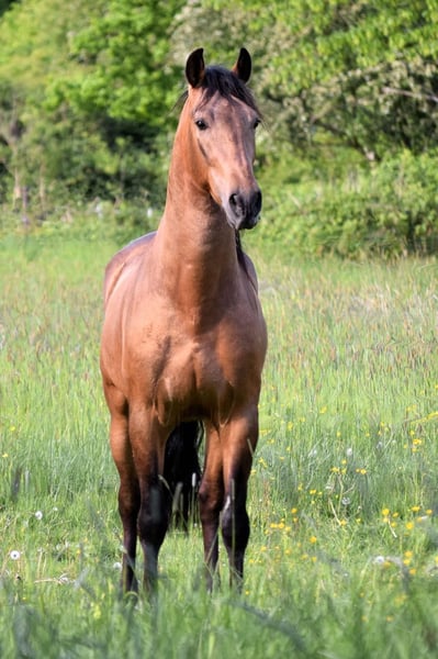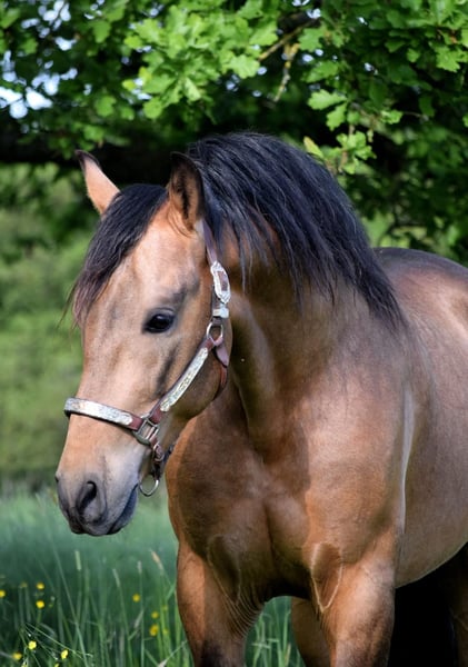 Stunning PRE gelding, born February 2021, in the rare color Buckskin/Falbe. He is very baroque in build, extremely compact, and has a correct conformation. In summer, his coat shines with a beautiful golden hue – truly eye-catching. With an approximate height of 16.1 hh, he provides excellent coverage for his rider and impresses with his striking appearance. The gelding is regularly dewormed and vaccinated and is accustomed to box and paddock turnout. Character-wise, he is an absolute treasure: friendly, affectionate, playful, well-mannered, brave, curious, open-minded, and very attached. Under saddle, he is incredibly comfortable to sit, demonstrates good basic gaits, and always works with motivation and eagerness to learn. He has a solid foundation of training: he walks all basic gaits, performs lateral movements, and can be ridden backward. On the ground, he also shows great talent – piaffe and Spanish walk are achievable. Groundwork is very familiar to him. A truly beautiful, talented horse for a motivated rider who enjoys working together and nurturing his potential.