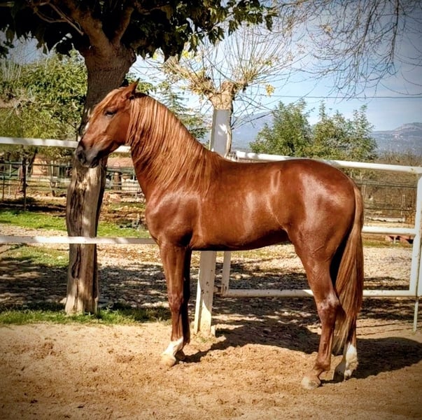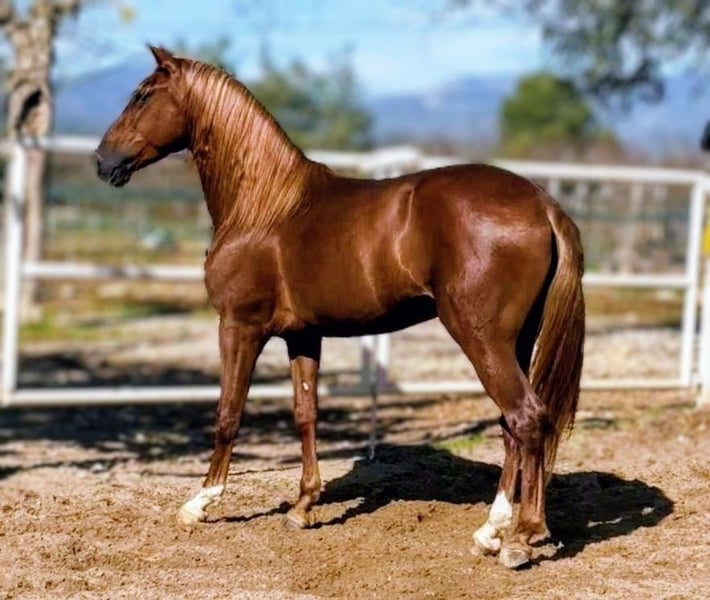 Tango......an incredibly beautiful and young PRE gelding in special color (chestnut) is looking for his FOREVER HOME. He is currently 1.60m tall but is expected to grow a few more centimeters, with a final height of about 1.63m anticipated. This stunning boy impresses with his amazing movement, expansive and elastic gaits, and a particularly loving and people-oriented character. He comes from an excellent private breeding and thus has very good social behavior. At 4 years old, he is well trained in all three gaits with a water snaffle. Of course, he still needs age-appropriate support to improve his balance. He is mostly worked in a relaxed manner in the field and is already very confident there, whether alone or in company. If you like this young, beautiful gentleman, please contact me with your phone number so I can get in touch with you as soon as possible.