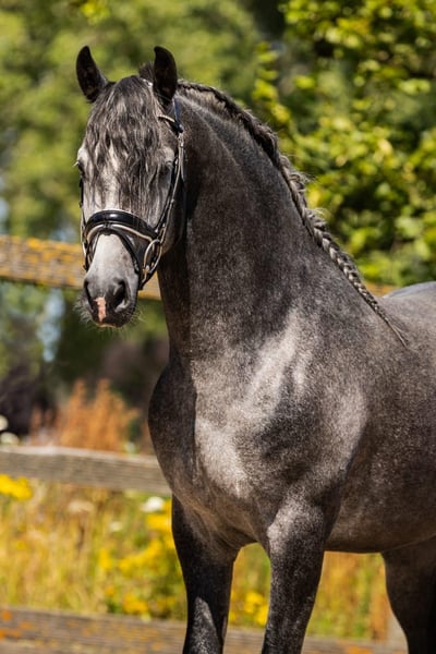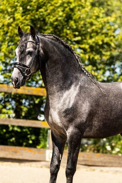 Dieser PRE Wallach ist nicht nur optisch ein Traumpferd, er bringt auch einen superlieben Charakter mit. Er ist 2020 geboren mit einem aktuellen Stockmaß von 164 cm(wächst noch). Der Wallach ist großrahmig und deckt daher auch gut größere Reiter ab. Er steht auf einem guten Fundament und läuft barhuf. Gute Röntgenbilder liegen vor. Sein Charakter ist einmalig. Sehr dem Menschen zugewandt, aufgeschlossen und aufmerksam. Er ist ein richtig cooler Typ, total unerschrocken und gelassen. Der Wallach war frisch angeritten mit auf einer Messe und hat sich da von nichts beeindrucken lassen. Er besitzt eine solide Basisausbildung, geht die Grundgangarten, rückwärts, Seitengänge usw.. Vom Boden aus wurde spanischer Schritt und Kompliment angefangen. Ein mega sitzbequemes Pferd. Der Wallach ist nicht nur bildhübsch, sondern in allen Bereichen ein Traumpferd. Besitzt volle Papiere des ANCCE.