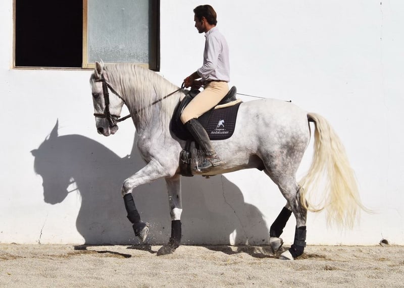 Sweet temperament, curious, affectionate, side passes, rein back, flying changes, bows, kneels, lies down, Spanish walk, Piaffe and Passage started, tall, good movement and pedigree. Pedigree: Yeguada Marques de Quintanar, Granda Losada, with several qualified ancestors. www.elegante-andalusier.com
