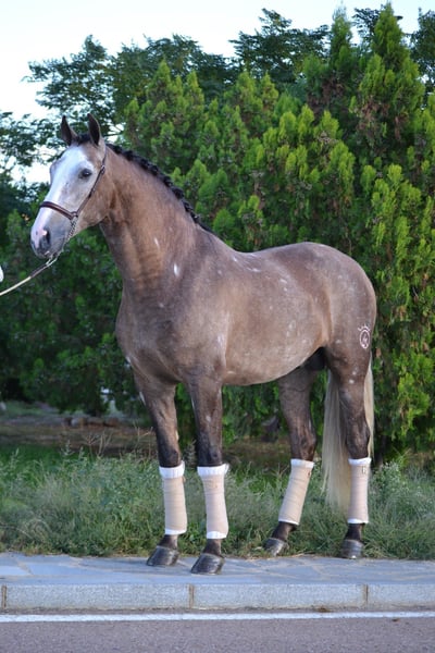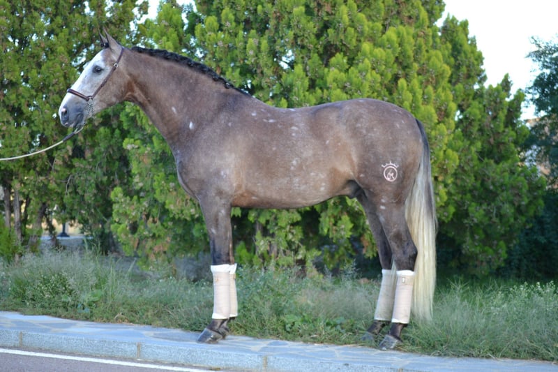 Er wurde Anfang dieses Jahres aus Spanien importiert und besitzt ein ausgezeichnetes Temperament, sowohl unter dem Sattel als auch im Stall. Er hat viel Charakter, liebt jede Aufmerksamkeit und Kuschelstunden. Seit seiner Ankunft hier zeigt er keine Stallprobleme; er wird über Nacht im Stall untergebracht und tagsüber mit einem anderen Wallach zusammen auf der Weide gehalten. Im Schulunterricht lernt er noch, daher benötigt er einen erfahrenen und geduldigen Reiter, der seine Ausbildung weiterführt. Er wurde langsam aufgebaut, zeigt aber drei gute Grundgangarten auf dem Platz, mit großem Trab und kraftvollem Galopp. Er ist sehr willig, hat eine ausgeprägte Arbeitsmoral und möchte stets gefallen. Kürzlich wurde er an Stangenarbeit gewöhnt und wird seine Fortschritte weiter machen, solange er zum Verkauf steht. Er hat bereits eine kleine Kreuzstange übersprungen. Er ist regelmäßig ausgeritten, meist alleine, reitet aber auch gerne in Gesellschaft ohne Nervosität. Er zeigt sich in offenen Räumen sehr manierlich und verhält sich ruhig in der Nähe von Autos, Fahrrädern, Hunden und Nutztieren. Da er noch jung ist, ist er neugierig und schaut sich gerne um, weshalb ein verständnisvoller Reiter erforderlich ist, der ihm bei Bedarf das nötige Selbstvertrauen gibt. In Zukunft wird er ein vielversprechender Dressur- und Freizeitpartner sein.
