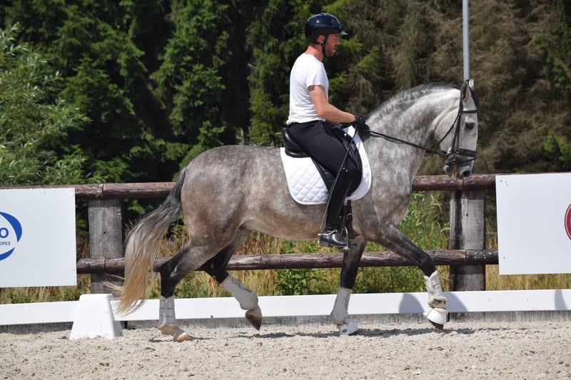 Wij presenteren een elegante, barokke uitstraling paard, geboren in 2020 en met een hoogte van 167 cm. Hij valt op door zijn schoonheid, morfologische harmonie en functionaliteit. Dit is een ideaal paard voor ervaren amateurruiters die op zoek zijn naar een betrouwbare metgezel met kwaliteitsvolle bewegingen. Wat betreft zijn training onder het zadel, reageert hij correct en duidelijk op hulpteugels en toont hij een coöperatieve en evenwichtige houding. Hij werkt momenteel aan gevorderde dressuuroefeningen, voert piaffes, pirouettes en supports soepel uit, waardoor hij een veelzijdig en zeer aantrekkelijk paard is voor wie recreatief wil rijden met extra technische vaardigheid. Zijn karakter is nobel en goed te hanteren, waardoor hij gemakkelijk te rijden is, zowel in de omgang als in de arena. Zijn barokke bouw geeft hem uitstraling en elegantie, zeer gewaardeerde eigenschappen bij dit type paard, terwijl hij comfortabel en plezierig is om op te rijden. Dit paard is een uitstekende keuze voor wie op zoek is naar een mooi, functioneel en betrouwbaar paard, waarmee men op een uitdagend niveau kan rijden, maar dat ook toegankelijk is voor een ervaren liefhebber.