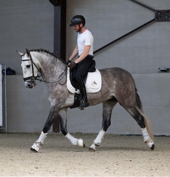 We present an elegant, baroque-looking horse born in 2020 and measuring 167 cm tall, who stands out for his beauty, morphological harmony, and functionality. He is an ideal horse for experienced amateur riders seeking a reliable companion with quality movement. Regarding his training under saddle, he responds correctly and clearly to aids, displaying a cooperative and balanced attitude. He is currently working on advanced dressage exercises, smoothly executing piaffes, pirouettes, and supports, making him a versatile and highly attractive horse for those who want to enjoy recreational riding with added technical skill. His character is noble and manageable, making him easy to handle both daily and enjoyable in the arena. His baroque physique provides presence and elegance, highly appreciated characteristics in this type of horse, while being comfortable and pleasant to ride. This horse is an excellent choice for those seeking a beautiful, functional, and safe horse, with which to enjoy riding at a challenging level yet accessible to an experienced enthusiast.