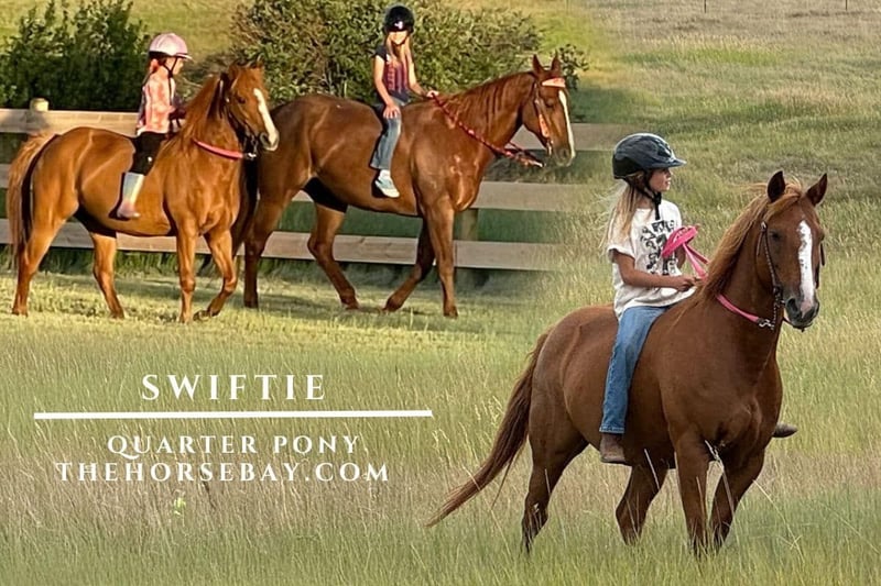 OPEN BIDDING ON THEHORSEBAY,COM. SALE ENDS ON 12/11. More information is available on the website, including an UTD vet inspection, Coggins, video, images, and the owner's contact information to ask questions, request information, or make arrangements to come to visit. Youth Rodeo Horse Extraordinaire! “Swiftie” is an 11-year-old sorrel Quarter Pony mare. Just shy of 14H, she sells grade, but she is 100% purebred Go-Pony! Swiftie is an absolute dream for any little kid who wants to go fast. She would make an excellent step-up horse for a youth ready to start winning at junior rodeos or Little Britches or 4H gymkhanas or playdays. My kids have won some money on her, and her previous owners took her to the Ohio State High School Rodeo Finals where she won the state goat-tying buckle. She is completely sound, sane, and healthy, with no vices. She can do 4H pleasure classes and collect and pick up the correct leads, but she is much happier at speed events. She can be ridden bareback with a halter and lead rope across the pasture or draped in rustling costumery for the Homecoming parade. She crosses water and bridges and goes alone or in a group. She leads, follows, and gets along great with every horse in the pasture. She has an exuberant puppy-dog personality, galloping up to greet you and following you everywhere. She LOVES attention and thrives in chaos, making her the perfect horse for an active family. She is strong and stocky built, so she is a handy size for an adult too. She’s an enthusiastic trail partner, and you don’t have to tear your pants trying to get on! Swiftie is probably better for a rider with some experience; while she’s never mean and has certainly never bucked, she gets excited and can be pretty forward. She requires an active rider; even though she is totally patterned, she will run right past a barrel if she’s not being steered. She doesn’t spook at ANYTHING, but she’s so forward and frisky that she can intimidate a less confident rider. She’ll walk into the ring flat-footed, but she’ll bound into action with the slightest permission. Swiftie has never known bad care; she has always stayed totally UTD on shots, farrier, teeth, and the highest quality feed. She has a new set up shoes, although she has wonderful hard hooves and goes just fine barefoot. Located in Fishtail, MT.