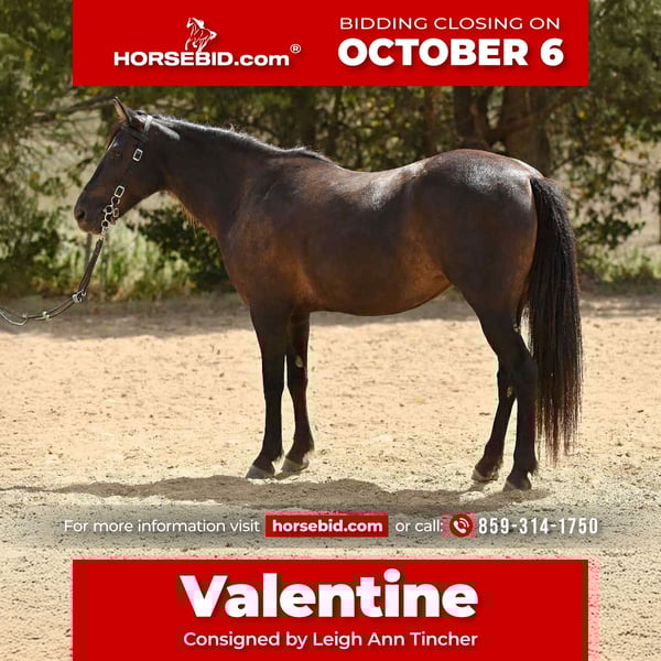 🍂 𝓐𝓾𝓽𝓾𝓶𝓷 𝑨𝑳𝑳 𝑺𝑻𝑨𝑹 𝑳𝑰𝑵𝑬𝑼𝑷 🍂 Happening now thru MONDAY | OCTOBER 6th - Available EXCLUSIVELY on HorseBid's website! For more details and to register visit: www.Horsebid.com CONSIGNOR CONTACT: Leigh Ann Tincher 859-314-1750 LOCATION: Richmond KY BREED: Quarter Pony REGISTERED: No REGISTERED NAME: Valentine COLOR: Dark Bay HEIGHT: 12.2 AGE: 7 GENDER: Mare Valentine is top notch when it comes to a nice pony! She is a super sweet grade, 12.2h quarter pony with a beautiful coat and mane. No blemishes, perfect feet, never foundered. Picture perfect health. She will be the first to meet you in the pasture and loves attention. Valentine is 7 years young and is the perfect trail or play-day rodeo pony. She knows the barrel and pole pattern and is very willing to show you her skills. She’s not just good in and out of the arena she’s perfect on trails and will go wherever you steer her. She will neck rein, and stand tied all day long. She loves to be bathed and loads and hauls like a dream. She would be best suited with slightly experienced rider because she does have speed when cued, but she’s also happy to go on a slow stroll. She is seasoned and safe to hauling anywhere and everywhere including the McDonald’s drive thru, and inside of Tractor Supply. Nothing much phases her- traffic,loud noises and quick movements. Shes sweet willing and patient. Valentine can be your kiddos next rodeo prospect, ranch partner or whatever path you want to take her! She’s been exposed to all livestock and could make a great ranch prospect. Let her be your kids next best friend!