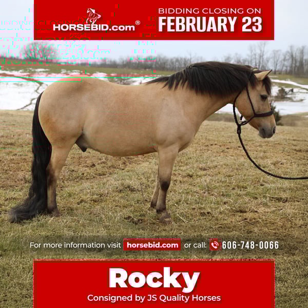💎 𝐓𝐇𝐄 𝓓𝓲𝓪𝓶𝓸𝓷𝓭 𝐒𝐇𝐎𝐖𝐂𝐀𝐒𝐄 💎 Happening now thru MONDAY | FEBRUARY 23rd - Available EXCLUSIVELY on HorseBid's website! For more details and to register visit: www.Horsebid.com CONSIGNOR CONTACT: JS Quality Horses 606-748-0066 LOCATION: Wallingford KY BREED: Quarter Pony REGISTERED: No REGISTERED NAME: Rocky COLOR: Buckskin HEIGHT: 13.1 AGE: 12 GENDER: Gelding We are proud to introduce “Rocky” , standing 13.1 hands and 12 years young, this fancy guy is sure to get you noticed wherever you may go! Rocky is not your average pony, and to be fair he identifies as a big horse in a small horse’s body. He has more riding ability and talent than most big horses, and always keeps that good minded, puppy dog personality ! Rocky has been in the same family for years, and it’s just time he goes on to teach another kiddo what riding is all about ! “Loyal, reliable, and kind “ are three words that come to mind when I think of rocky, no matter the weather or the time that has passed Rocky is the same pony no matter what. Don’t want to walk 10 acres to find your new best friend ? Good your in luck! Rocky will come right to you, and enjoys being wherever his new friend is ! Rocky is easy, no matter what aspect we are referring to, Rocky stands for the farrier, stands to be saddled, stands to be mounted, clipped, bridled,and bathed. Rocky is broke like daddy’s ranch horse, Rocky has a one hand neckrein, he slides to a stop on whoa, he will turn around like a broke horse should. Rocky catches his leads and will do flying lead changes, with ease. No bridle ? Saddle ? Don’t fear , Rocky got you covered ! Pull Rocky’s bridle off and ride him anywhere, he’s as handy as a pocket watch ! Rocky has been roped on, and has drug small steers, he’s also been roped out of the box on the heel and head side, on slower calves as well. Rocky tracks good and has a lot of cow sense to him. Got a little cowgirl in mind for Rocky ? We are glad to hear because not only does Rocky love to be brushed and loved on, Rocky also enjoys the barrels and poles or having his hoofs painted, he will gladly spend time with his partner and enjoy every second of it ! Rocky has been used to gather and sort cattle, and will go anywhere asked of him, there’s not a creek to deep or a hill to steep , he’s as sure footed and good minded as they come. Rocky is not only just a pony, he’s part of the family and we hope his new adventure in life will Appreciate him and spoil him like he deserves ! If your wanting a honest , loving, flashy, talented kinda guy, look no further rocky is ready for his new chapter and we hope you choose him !