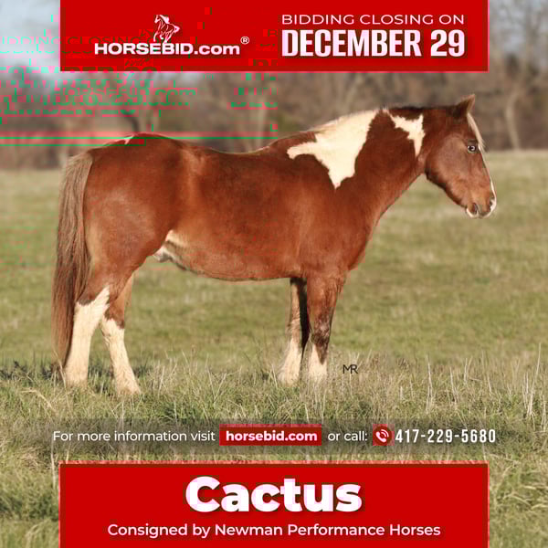 ⚜️𝐓𝐇𝐄 𝓗𝓮𝓻𝓲𝓽𝓪𝓰𝓮 𝐖𝐢𝐧𝐭𝐞𝐫 𝓒𝓵𝓪𝓼𝓼𝓲𝓬⚜️ Happening now thru MONDAY | DECEMBER 29th - Available EXCLUSIVELY on HorseBid's website! For more details and to register visit: www.Horsebid.com CONSIGNOR CONTACT: Newman Performance Horses 417-229-5680 LOCATION: Verona, MO BREED: Quarter pony REGISTERED: No COLOR: Paint HEIGHT: 12 AGE: 12 GENDER: Gelding If you’re looking for the perfect pony for a little cowboy or cowgirl, meet Cactus - a 12 hand 12 year old paint pony with blue eyes and a personality that’s incredibly sweet and loving! He is the type you can truly turn your kids loose on and not have to worry. Cactus has been trail ridden and takes everything in stride. He will walk, trot, and canter. He stays quiet and willing the whole time. On the ground, he is just as dependable cactus is super gentle, easy to tack catch and handle. He stands perfectly for baths, grooming, mounting, and anything else you will need to do with him. Cactus will be the first one to meet you at the barn, eager for attention and happy as can be. He is incredibly versatile and knows a full days work gathering pairs, doctoring yearlings, or pushing roping steers. Cactus is the whole package and handsome too boot!