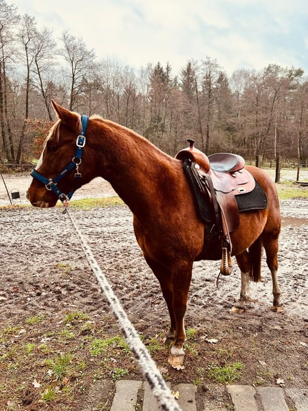 Jonge Quarter-merrie in goede handen te plaatsen. Socke kwam vorig jaar als gezelschapspaard bij ons en liep samen met een Tinkermix op de grote wei. Hij is halster- en longeerbaar, kent de hoefsmid, dierenarts, trailer rijden, poetsen en aan de longeerlijn. Voorwaartse standfouten. Het wordt nu tijd dat hij zijn eigen weg gaat. Hij is wat dominant en zal af en toe vragen of jij nog steeds de baas bent. Vanwege gezondheidsredenen is er nog geen grondwerk met hem gedaan. Geen Quarter-papieren aangevraagd, maar de ouders zijn wel bekend. Het paard heeft alleen een groen paspoort.