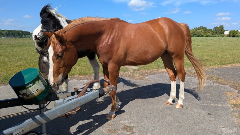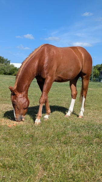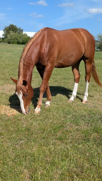 Junger Quarter Wallach in fördernde Hände abzugeben. Socke kam letztes Jahr als Gesellschaftspferd zu uns und ist mit einem Tinkermix zusammen auf der großen Weide gelaufen. Er ist halfterführig, kennt Hufschmied, TA, hängerfahren, putzen und anbinden. Stellungsfehler vorne Nun wird es für ihn Zeit seinen eigenen Weg zu gehen. Er ist etwas dominant und wird öfter mal fragen, ob du noch der Chef bist. Es wurde aus gesundheitlichen Gründen noch keine Bodenarbeit mit ihm gemacht. Keine Quarter Papiere beantragt. Eltern sind aber bekannt. Das Pferd hat nur einen grünen Pass