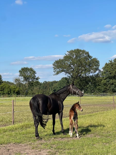 Dkl. Brown Verband Premium Mare, born 2010, approximately 1.70 m By Dancier, Dam Sire: Wolkenstein II (Granddam Sire: Star Regent xx) Currently in foal to Dynamite, due in March 2026 Dynamite (Debutant PS, Dam Sire: Feinrich) – Standing at Kanziora Breeding Station In 2022, she foaled a filly by Escolar (sold to the USA), and in 2024, a colt by Benicio (sold within Germany). - Previously ridden and placed in young horse competitions - She is very people-oriented, completely herd-safe, uncomplicated, and well-behaved - Easy to load and unproblematic at the blacksmith For sale due to discontinuation of breeding activities