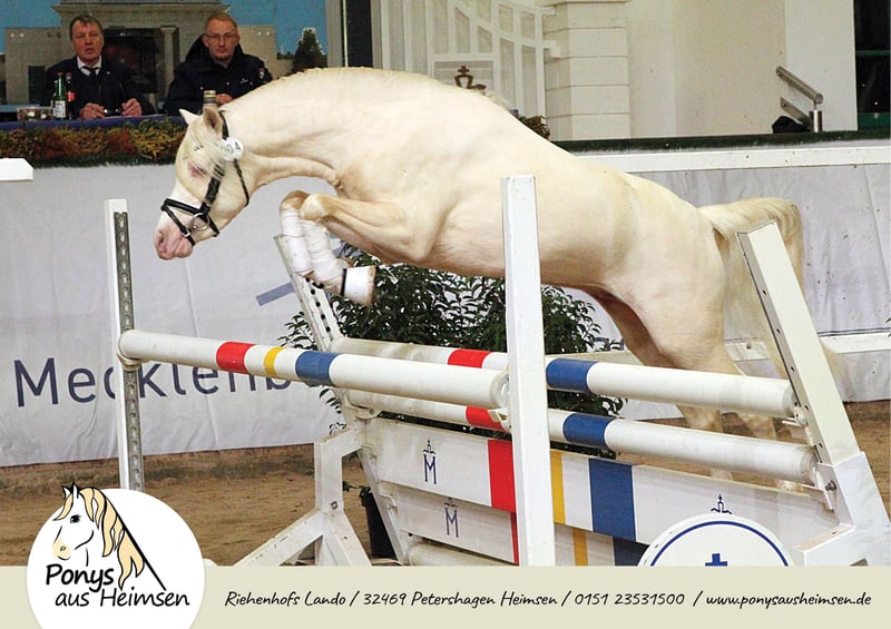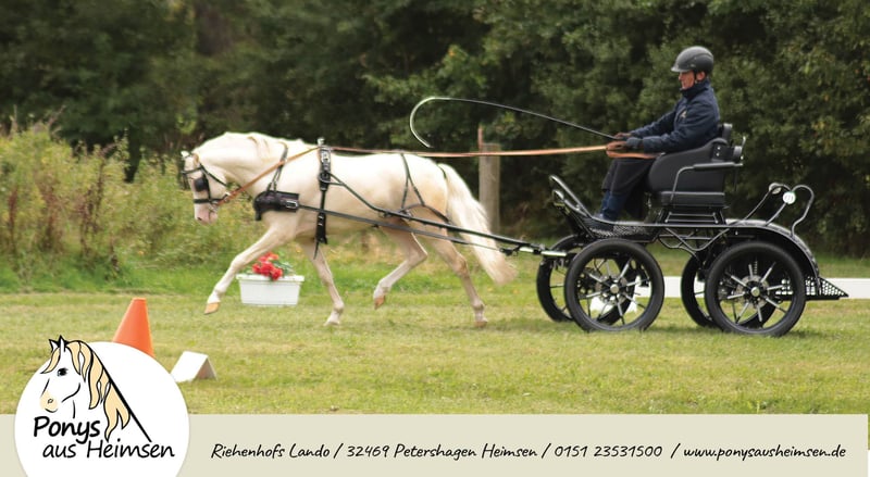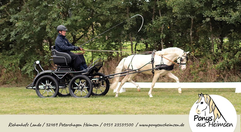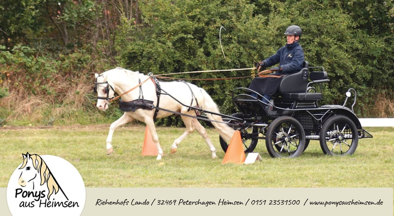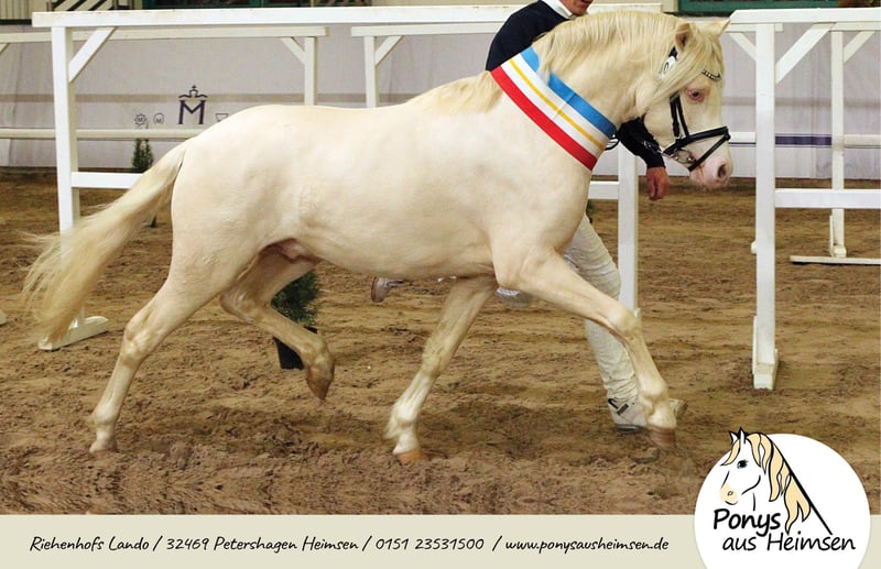 Riehenhofs Lando - Ponys aus Heimsen Mit enormen Bewegungspotential ausgestattet, überzeugte Lando in allen Belangen und wurde als Prämienhengst und Reservesieger der Körung in Redefin auf dem Endring herausgestellt. Auf der Hengstkeistungsprüfung in Offenbüttel stellte er seine herausragenden Fahreigenschaften unter Beweis, und wurde mit einer sagenhaften 8,85 Leistungshengst als Reservesieger. Er gibt seinen unverwechselbaren Welsh-Typ und freundliches Wesen sicher an seine Nachkommen weiter - und das in Sonderfarbe! Seine Arbeitseinstellung und Gutmütigkeit in der täglichen Arbeit, vorm Wagen und unter dem Sattel machen das Training mit ihm zu einer wahren Freude und sind das aller wichtigste für eine nervenstarke und leistungsbereite Pony-Nachzucht. Landos Fohlen überzeugen mit Ihrem einwandfreien Charakter, Ausdrucksstärke und enormer Trabmechanik, die wunderbare Kinder-, Fahr- und Freizeitpferde für die ganze Familie sind - Ponys für alle Fälle und das große Viereck! Seine ersten beiden Fohlenjahrgänge waren hoch erfolgreiche Prämien- und Siegerfohlen und überzeugten auf ganzer Linie Richter, Züchter und Besitzer. Riehenhofs Lando stammt ab vom hoch erfolgreichen Prämien- und Leistungshengst Woldberg‘s Leonardi, der 2023 bei der FN-Bundeshengstschau auf der Grünen Woche in Berlin zum Bundes-Reservesieger im Schauwettbewerb der Welsh Ponys (Sektion B) gekürt wurde und die FN-Bundesprämie erhielt. Der Muttervater Timing, selbst ein Sohn des Vierspänner-Weltmeisters Tizian/Tobias Bücker, absolvierte seine HLP 2007 in Thüle mit 8,63 als Sieger, nahm dreimal an Weltmeisterschaften teil und verbuchte zahlreiche weitere internationale Siege und Platzierungen. Die Mutter Verb.Pr.St. Ella brachte noch die St.Pr.A. Riehenhofs Elba (v. Nilanthoeve‘s Zippo), die 2021 für die Elitestutenschau Weser-Ems in Hude-Wüsting zugelassen war und stellte jüngst den Körungssieger der Welsh B in Weser Ems. Überzeugt Euch von unserem tollen Hengst für Eure Zuchtstuten! - Anerkannt für Westfalen, Weser-Ems und Hannover - Farbe Cremello (Farbgentest: A/a, Cr/Cr, e/e) - CA-frei, PSSM-frei - Unterbringung der Gaststuten im Offenstall, Ausbildung und Beritt zeitgleich möglich www.ponysausheimsen.de 015123531500