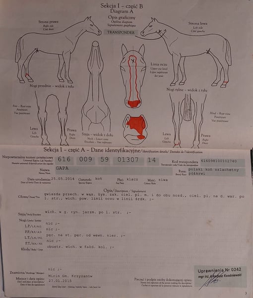 Klacz śląska Gapa, urodzona w 2014 roku, jeźdzona i zaprzęgana, po dwurocznej przerwie macierzyńskiej gotowa na nowe wyzwania, wzrost 168 cm.