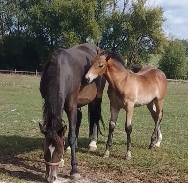 For sale: beautiful Pogrubiany/Shiite mare Year of birth: 2023 Current height: approximately 160 cm (15.3 hh), expected final height: around 166 cm (16.1 hh) Mother: Pogrubiany type Father: Silesian She has a buckskin coat with a blaze and four white socks. Ideal for those who appreciate tradition and high quality. The mare is ready for further breeding or riding. She is accustomed to grooming routines. Occasionally, she can be a bit impatient. UNBROKEN Interested? Please contact us!