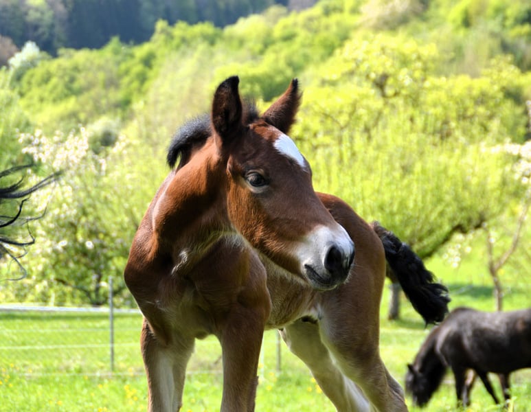 Donatus van Dachsbub, afkomstig uit onze Armada, is een echte blikvanger. De lange, elegante en beweeglijke hengst vertegenwoordigt het moderne Schwarzwälder-type. Zijn halfbroer is de Bundsprämienhengst Rasputin. Donatus zal zich bewijzen als een ambitieus recreatiepaard en/of als hengstenkandidate. Hij groeit op in een gemengd kuddeverband en kent alles wat een veulentje in zijn leeftijd moet weten. Hij is gewend om hoefijzers te geven, aangebonden te staan, te worden geleid, en heeft contact met kinderen en landbouwmachines. We hopen op een gezonde toekomst voor deze prachtkerel.