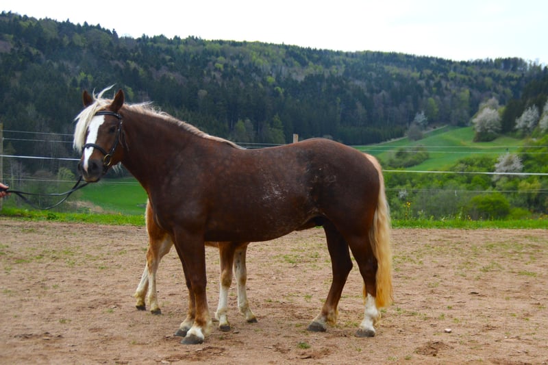 Roberta de Dagobert, issue de Rohana de Wildschütz, aura en février 2026 ses 5 ans. Elle mesure actuellement 149 cm au garrot et a été inscrite cette année au stud-book. Née chez nous, Roberta a grandi au sein de notre troupeau en paddock. C’est une jument amicale, sympathique et élégante. Elle a été mise en selle au printemps de cette année et a réussi avec succès son épreuve de traction en septembre, avec une note de 7,4. Sa capacité de conduite a été particulièrement appréciée par le meneur extérieur, qui lui a attribué la note de 8,5. Elle a été conduite aussi bien en harnais simple qu’en paire, et a démontré son courage ainsi que sa fiabilité lors de déménagements et de présentations en exposition. Elle est principalement montée en extérieur, dans toutes les allures de base, et se comporte toujours de manière correcte. Nous pouvons envisager Roberta comme un excellent cheval de famille ou de loisirs.