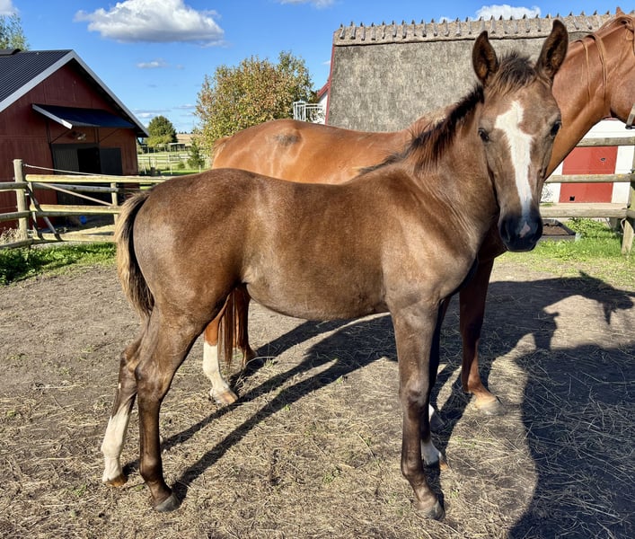 🌟 Gallardo’s Nera (filly, born May 23, 2025) An exceptional young filly with a wonderful temperament, correct conformation, strong legs, and three expressive, elastic gaits. Nera is Gallardo’s third foal and clearly continues the line’s outstanding quality and character. Her dam Gallardo was started under saddle at 2.5 years old and proved to be extremely intelligent, eager to please, and easy to ride. She has already produced three highly promising foals: • Super Trofeo (2022, by Asterix de Couleur) – sold at the 2022 Elite Foal Auction. Shows excellent jumping technique and remarkable carefulness and awareness when free jumping. • Superleggera (2023, by Asterix de Couleur) – displays the same sharp mind and eye-catching jumping style as her brother. The granddam Harmonie Hästak successfully competed up to 1.40m level herself. She is the full sister to a 1.50m Grand Prix horse and has several half-siblings competing up to Medium and Advanced level show jumping. Harmonie has also produced offspring up to Medium level, including Centenario, who was placed in the 6-year-old final at Falsterbo Horse Show and is now sold to Shane Sweetnam in Wellington. 📞 For more information and videos, please contact +46 736 775 747. 🎥 Videos are also available of Nera’s siblings and granddam Don't miss the opportunity to own a future star in the making.
