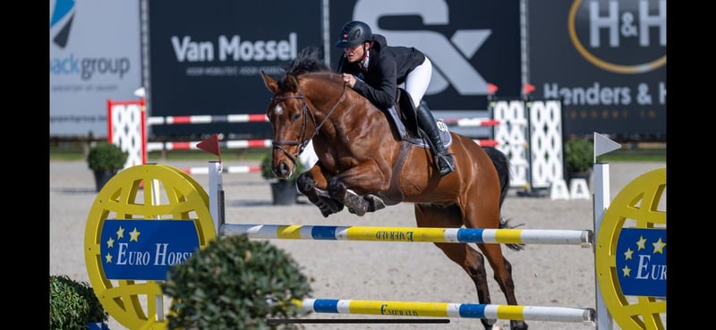 Umour is a cheerful and lovable gelding. He has been carefully trained (no shortcuts taken), and he needed this time, as he was quite spirited as a young horse. His dam has competed successfully up to Grand Prix and Nations Cup level, as has his sire, Urano de Cartigny. Currently, he confidently competes in classes up to 135 cm. He has also cleared over 140 cm with zero faults, although higher fences are still above his comfort zone. The gelding is generally comfortable and a bit lazy in daily work but rides nicely. He is very well-behaved in the field. In show jumping, he can sometimes be lively and strong, always eager to go forward, with good basic caution, but he is not fearful and can forgive a mistake. In handling, he is very affectionate and well-mannered, always wanting attention, which he sometimes shows with playful antics. In terms of conformation, Umour is rather square, with a short neck and smooth, supple movements. Umour is not suitable for beginners, as he can test boundaries and try to see who is in charge. However, thanks to his compact build and reactive jumping style, he is a safe and enjoyable partner for an amateur rider up to category 130/135.