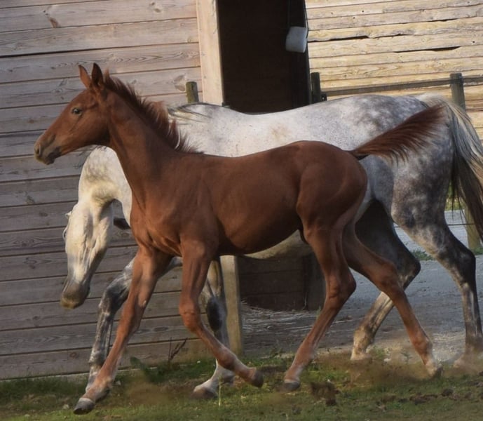🚀 PROPOSED – Male CSO Foal by Highway TN N.O.P 🚀 Sarthe (72) | Born May 23, 2025 | Chestnut gelding Looking to invest in the future? Meet Pallas! Promising bloodlines for sport: ♂️ Sire: Highway TN N.O.P (Eldorado vd Zeshoek x Chellano Z) – A very modern stallion competing at the highest international level. – Renowned for his quickness over fences, respect, and exceptional intelligence at the jump. These qualities are passed on to his offspring, who are already making their mark on international young horse circuits. – His consistency is remarkable: he has jumped 24 clear rounds in a row and has won 4 Longines-ranking events. ♀️ Dam: Galiska de l’Ortier (Cicero Z x Dollar du Mûrier) Daughter of Cicero Z and Qurischka de l’Ortier (Dollar du Mûrier x Quat'Sous). A mare from a successful cross, unfortunately injured at age 3, which prevented her from pursuing a promising sporting career. GALISKA’s dam also produced Cécedille de l’Ortier, competing at 1.45m in the USA, and Eurêka, whose promising career was abruptly cut short. In addition to his champion pedigree, Pallas possesses all the qualities required (strength, balance, mental focus…) to become a horse of the future and, for the most ambitious, a breeding stallion. Pallas is a foal that will not leave you indifferent; he has a tremendous presence. Feel free to come and meet him. Videos available upon request of his dam, Cécedille, and Eurêka. Visible in Sarthe.