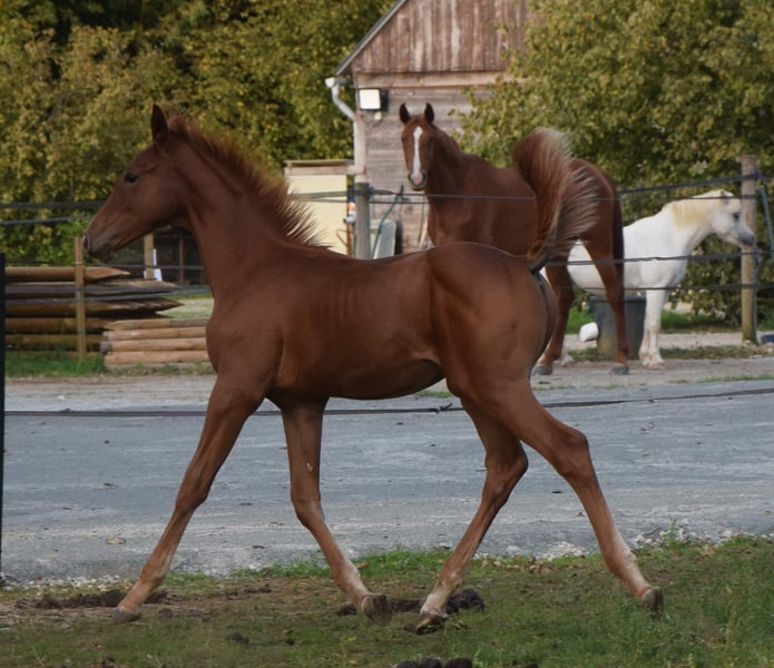 🚀 PROPOSE – Hengstfohlen CSO von Highway TN N.O.P 🚀 Sarthe (72) | Geboren am 23. Mai 2025 | Roter Wallach Sie möchten in die Zukunft investieren? Dann präsentieren wir Ihnen Pallas! Vielversprechende Abstammung für den Sport: ♂️ Vater: Highway TN N.O.P (Eldorado vd Zeshoek x Chellano Z) – Ein äußerst moderner Hengst, der auf höchstem internationalen Niveau erfolgreich ist. – Bekannt für seine Schnelligkeit, seine Respektlosigkeit und seine außergewöhnliche Intelligenz an der Springstange. Diese Qualitäten gibt er an seine Nachkommen weiter, die sich bereits auf internationalen Youngster-Turnieren behaupten. – Seine Konstanz ist außergewöhnlich: Er hat 24 aufeinanderfolgende fehlerfreie Parcours absolviert und gewann 4 Longines-Ranglistenturniere. ♀️ Mutter: Galiska de l’Ortier (Cicero Z x Dollar du Mûrier) – Tochter von Cicero Z und Qurischka de l’Ortier (Dollar du Mûrier x Quat'Sous). Eine vielversprechende Kreuzung, die leider im Alter von 3 Jahren durch eine Verletzung ihre vielversprechende Sportkarriere beenden musste. Die Mutter von GALISKA hat unter anderem Cécedille de l’Ortier hervorgebracht, die in den USA bis 1,45 m springt, sowie Eurêka, dessen vielversprechende Karriere abrupt beendet wurde. Neben seiner Champion-Abstammung besitzt Pallas alle erforderlichen Qualitäten (Kraft, Balance, Mentalität…), um ein vielversprechendes Springpferd zu werden, und für die ambitionierten Züchter auch das Potential, ein Deckhengst zu sein. Pallas ist ein Hengstfohlen, das Sie nicht unberührt lassen wird – er besticht durch seine beeindruckende Präsenz. Zögern Sie nicht, ihn kennenzulernen. Videos auf Anfrage seiner Mutter, Cécedille und Eurêka. Besichtigung in Sarthe möglich.