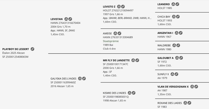 A vendre Playboy de Lessert Male de l’année SF, du chic, du déplacement, de la taille. Gentil et bien manipulé. Par Galyska des Lyades SFO, par MR FLY DE LANDETTE, Étalon, 𝗦𝗙𝗢, ISO 135, par Galoubet A et Sunfly (AA). Accidentée à 2 ans, Galyska n’a pu être valorisée mais montrait néanmoins de beaux moyens. Et Levistan Hann par Levisto, Production déja confirmée, avec notamment Comic Star ISO152.