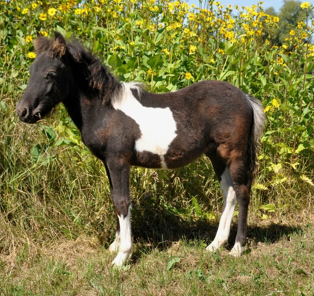 Born in May 2025, this promising Shetland pony stallion is looking for a loving home. He is expected to be just over 1 meter tall and impresses with his expressive black pinto coat, correct conformation, and very good gaits. His sire, Galant v. Hendrijntje, is a premium stallion and winner of the stallion performance test – a modern stallion with strong presence and convincing type expression. The dam's sire, Kronprinz van de Niederlanden, holds the title of Elite Stallion and has already produced numerous high-quality offspring. The proven dam line is particularly noted for its child-friendliness – it has produced several well-behaved ponies that are now successfully used in riding lessons or as leisure partners for children. The young stallion is growing up in a species-appropriate herd environment and has so far shown himself to be curious, clear-headed, and very pleasant to handle. Color: Black pinto Expected height: approx. just over 1 m Pedigree: Galant v. Hendrijntje (premium stallion, HLP winner) × Kronprinz van de Niederlanden (elite stallion) Only to be placed in horse-appropriate, loving hands. If interested, we look forward to hearing from you!