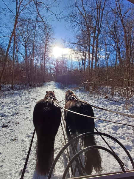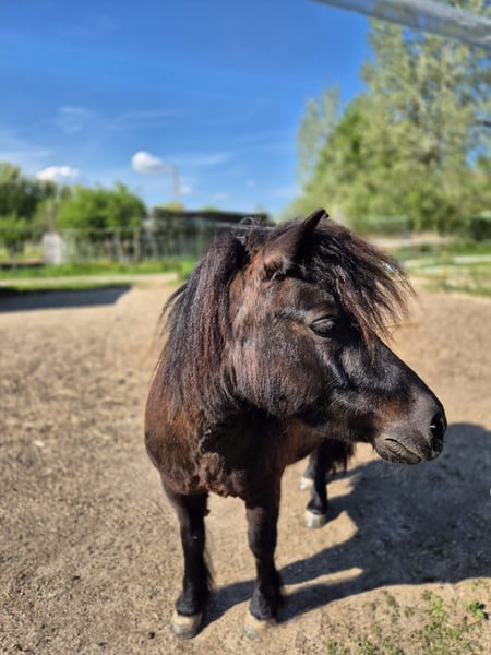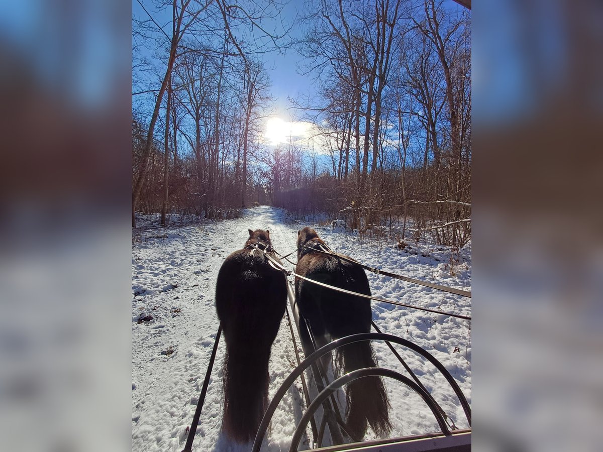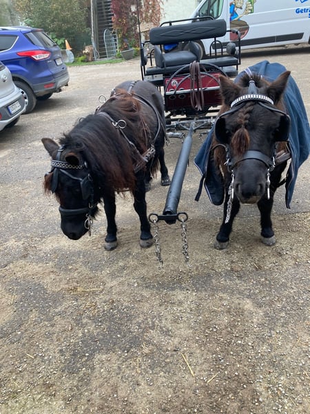 Rappe und Winterrappe - Shettystuten ggf in allerbeste Hände herzugeben. Glöckchen und Vroni ( eigentlich Olivia ) sind ca. 1,02m und ca. 1,03m groß, schwarz bzw. schwarzbraun, sind absolut sicher zweispännig gefahren! Beide sind auch einspännig vor der Kutsche sowohl auch vor dem Sulky gefahren, mit dem Sulky fahren müsste wieder aufgefrischt werden. Dies kam immer zu kurz. Seit Januar 2024 laufen sie vor der Kutsche und wurden mit unserer Fahrlehrerin am Stall ausgebildet. Glöckchen ist im April 2019 und Vroni im Mai 2020 geboren und sind auch schon beide geritten! Jedoch auch dies müsste wieder aufgefrischt werden, da es an Kindern mangelt die reiten können. Im therapeutischen Reiten wurden sie oft beim Führen von behinderten Kindern eingesetzt. Beide Ponies haben sehr gute Abstammungen, diese können auf Anfrage geschickt werden. Sie leben im Offenstall. Die Sommer Fliegedecken, haben wir nur benötigt weil wir in der Donaunähe mit extrem vielen Kribbel- und Hirschlausfliegen konfrontiert waren. Sie sind kerngesund, gepflegt, Zähne gemacht und regelmäßig entwurmt und vorne vom Hufschmied beschlagen. Hinten werden sie mit Hufschuhen gefahren. Die beiden sind beim Fahren sehr sicher und waren auch schon auf einem Kurs zum Kegelfahren. Eine weitere Ausbildung im Turniersport könnten wir uns vorstellen. Jedoch sind es keine Ponys für einen reinen Fahranfänger da auch sie eine souverände Handhabung und Unterstützung benötigen. Sie sind aber keine reinen Kinderponys - dafür sind sie zu schlau und nehmen Kinder nicht so richtig ernst. In Kombination mit Erwachsenen ist alles einwandfrei. Absolut sicher gefahren und straßen und geländesicher! Wir geben sie nur zusammen ab und nur in das perfekte Zuhause- am allerliebsten an Fahrer! Das war seit Januar 2024 3-4x die Woche ihre Aufgabe. Eine angepasste polnische Kutsche, ein sehr hochwertiger Glinkowski Sulky , ein hochwertiges Geschirr , ein sehr gut passender Sattel, Abschwitzdecken, Fliegenfahrdecken und vieles weitere an Zubehör kann gerne dazu erworben werden… Preis nicht im unteren Bereich und der Qualität entsprechend!