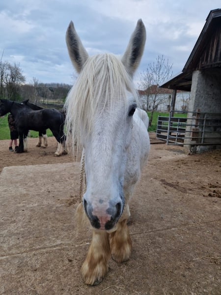 ✨ Beautiful Shire Mare – Loyal Companion for Leisure and Heart ✨ For sale is an impressive Shire Horse mare, born in 2009. This elegant grey mare impresses with her imposing height of 1.80 m, her calm demeanor, and her loving nature. She is the perfect leisure horse – reliable, people-oriented, and with a gentle, balanced temperament. Both under saddle and in daily handling, she is friendly, well-behaved, and attentive. She has been consistently well cared for, regularly vaccinated, dewormed, and veterinary checked. The farrier and trailer loading are no problem for her. Due to a wart conformation, which is easily manageable with proper care, she is being offered at a significantly reduced price – instead of €6,000, now €3,900. This minor issue does not affect her daily performance but requires some regular attention during grooming. She is ideally suited for experienced horsepeople seeking a gentle, honest, and impressive leisure, groundwork, or relaxed riding partner. With her charisma and character, she is a true heart horse that offers her trust and affection to her owner.