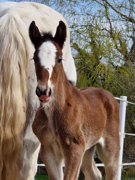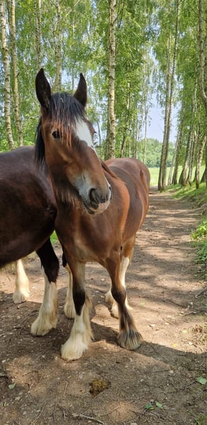 Thank you for your interest in our Shire Horse mare Ashanti. Ashanti is a particularly charming mare for sale, distinguished by her beautiful coloring and her sweet character. Shire Horse mare Ashanti was born in the summer of 2024 and is a curious and people-oriented young Shire horse lady. She comes from our own breeding and has been in our care from the very first moment. Both parent animals also impress with their balanced and loving character. Ashanti is growing up with her foal friends in a mixed herd on our spacious pastures. We wish for her a new home with plenty of horse companionship and playmates. In the group, she is confident and sociable. She is very affectionate towards humans, uncomplicated, and curious. She is halter-trained and knows all the things a weanling should know. She currently finds hoof care a bit annoying, but we are intensively working with her on this. Of course, Ashanti is chipped, vaccinated, regularly dewormed, and her hooves are maintained. Both parent animals are registered breeding animals of the English Shire Horse Society. Therefore, it is fundamentally conceivable for Ashanti to be used as a breeding mare in a few years. If you are looking for an exceptionally beautiful Shire Horse with a gentle and people-oriented character, which you would like to lovingly accompany as a partner in your life, please feel free to contact us. Our animals are only placed in the best hands and an age-appropriate home, so it is important to us to take enough time for interested parties. It is also important to us that the horse has a say in the decision, as the chemistry must also be right for our animals. We would be happy to arrange a non-binding meeting with Ashanti as a "Shire Horse Day or Weekend" at our farm, so that a mutual "getting to know each other" can take place in a calm and stress-free manner. Ashanti lives near Bad Füssing, and we will gladly send the exact address upon scheduling an appointment. There are overnight accommodations with great food within walking distance of our farm. Additionally, there are several beautiful spas and swimming lakes in the vicinity, making a small vacation in our area definitely worthwhile. "Non-riders" are also very warmly welcomed here. We also offer guided rides and hikes with our gentle giants in beautiful nature. Less experienced riders are welcome to join us; in this case, the horse will be led from the ground. Gift vouchers for this are also available and have already provided many lovely (birthday) surprises. Further impressions of our horses can also be found on our WhatsApp channel. If you are interested, we would be happy to send you the link. We look forward to your message.