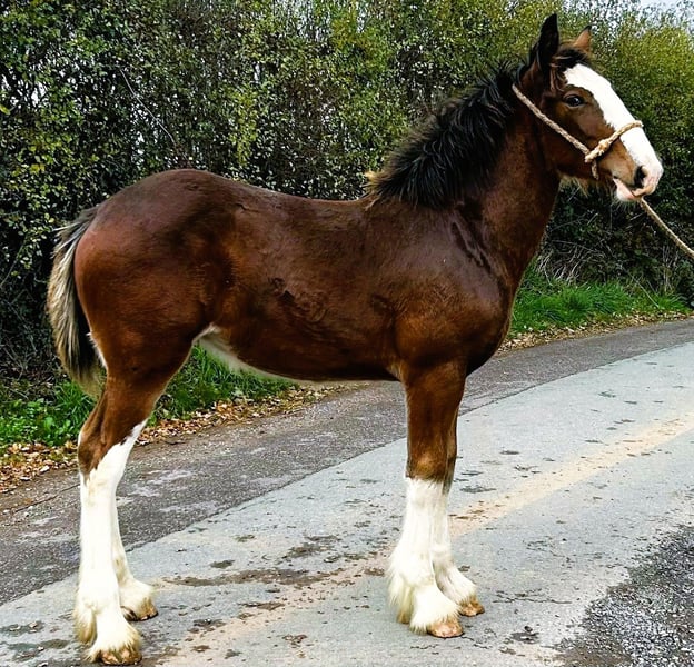 A very pretty filly. This perfectly marked filly foal/yearling is just gorgeous. An extremely attractive rich bay, perfectly marked with four white legs. She won't be huge and should make the prettiest of riding or driving mares. Show quality and in lovely condition. Shire horses for sale from the home of champions. Clydesdales available. 01606 883869
