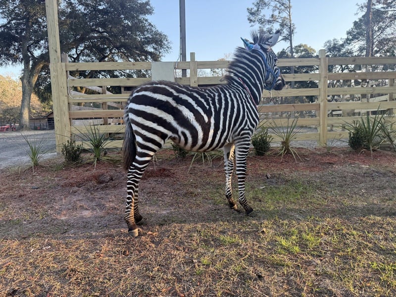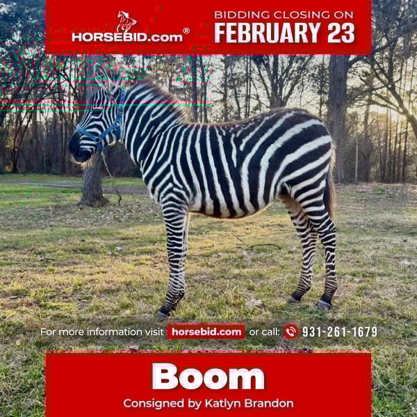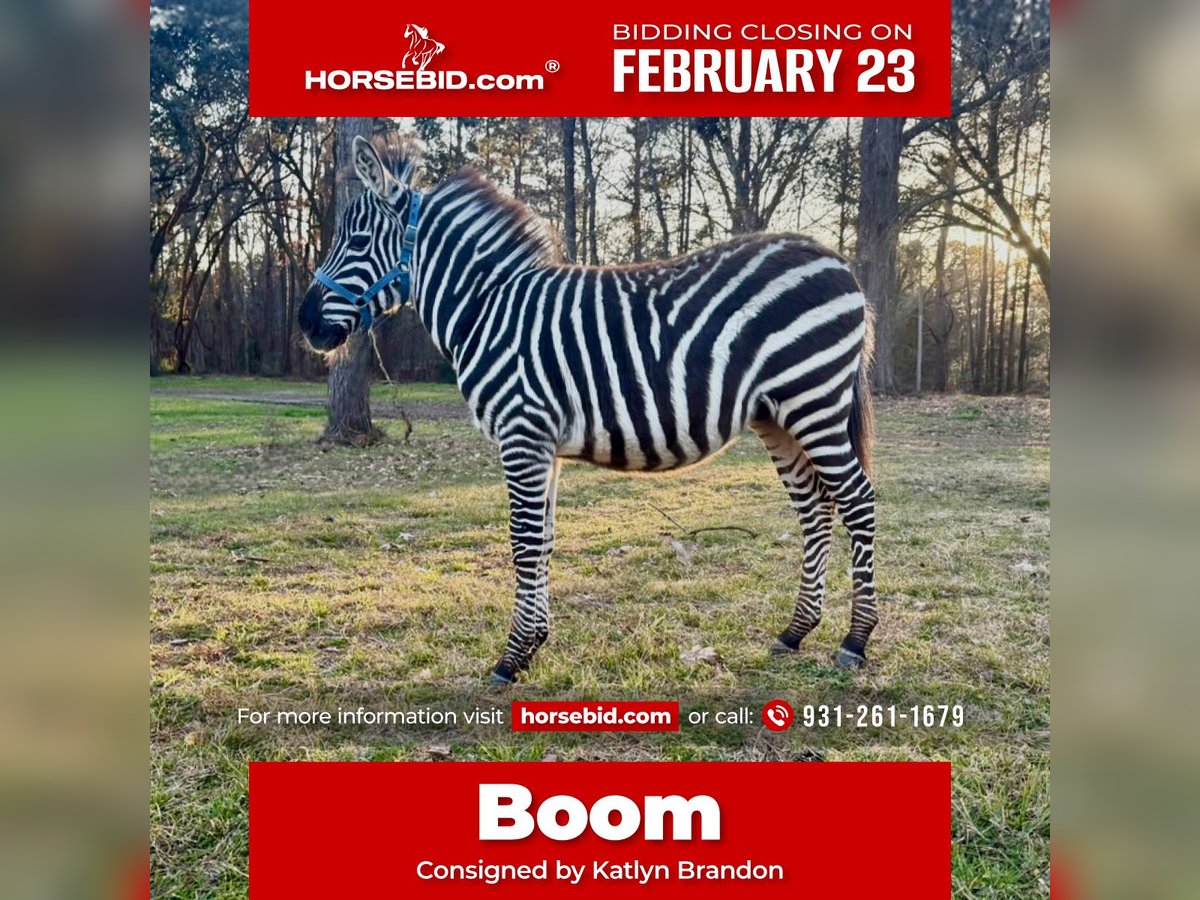 💎 𝐓𝐇𝐄 𝓓𝓲𝓪𝓶𝓸𝓷𝓭 𝐒𝐇𝐎𝐖𝐂𝐀𝐒𝐄 💎 Happening now thru MONDAY | FEBRUARY 23rd - Available EXCLUSIVELY on HorseBid's website! For more details and to register visit: www.Horsebid.com CONSIGNOR CONTACT: Katlyn Brandon 931-261-1679 LOCATION: Ridgeland SC BREED: Zebra REGISTERED: No REGISTERED NAME: Boom COLOR: Black and White HEIGHT: 40 inches AGE: 0 GENDER: Colt Boom is a stunning 5 month old Zebra Colt. He has been raised in a petting zoo and exposed to many things. Beyond his beautiful markings, he is full of personality! He spends his days playing with his donkey friends, goats, and all of the other funny critters around here. When he is turned loose to enjoy the sunshine he is always nosing around to see what we are doing. He is easy to catch and comes right up to us. Boom stands tied to be brushed and picks up his feet. He leads very easy and gentle. At 5 months old he has shown much promise to continue his education and go in any direction you want to take him. Whether you want a beautiful pet or eventually a riding partner, boom will be a unique experience for either. Boom stays in a normal horse stall during the night and tired out during the day. He stays in a normal fence and respects his boundaries. He has also been in panels with no concerns from us. Zebras use the same veterinarian as equine and require the same basic care. He is so much fun to have around and we will be glad to answer any questions you may have! Please reach out to me at anytime, 9312611679!