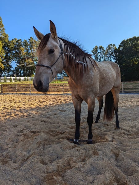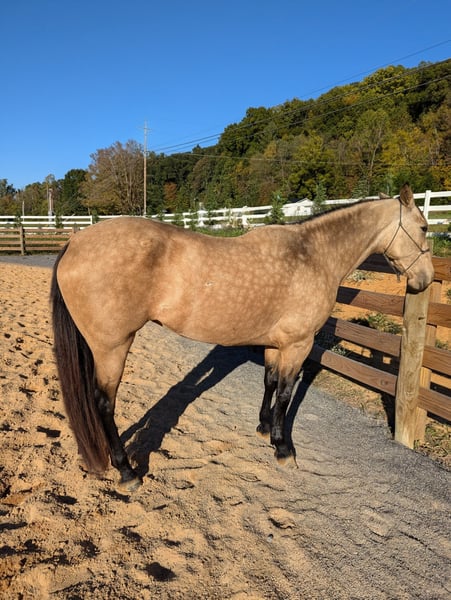3yr old quarter horse draft cross. This beautiful buckskin is fresh out of her 60 days in training and is looking for her new home. She would be a great ranch riding prospect for someone. She turns on haunches, is a beautiful mover, side passes, will do flying lead changes just needs consistency, will collect, soft and supple, calm mind, hobble trained, and works the same outside of an arena. Very confident, willing, and good looking mare. She is solid, quiet and calm, walk, trot, canter, all on a loose rein in an arena or in a field. Stands at 15.1-2hh. Leads, loads, hauls, stands tied, UTD on farrier, vaccines, dewormer. 100% sound, PPE welcome. Contact at ↓↓ ◾423-930-6022 📍 Jonesborough TN