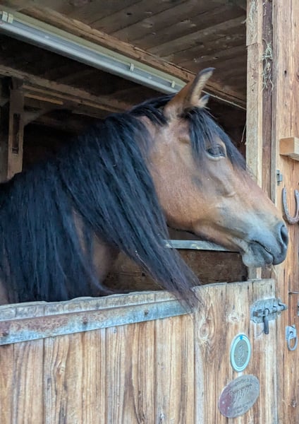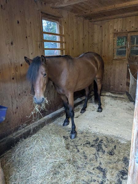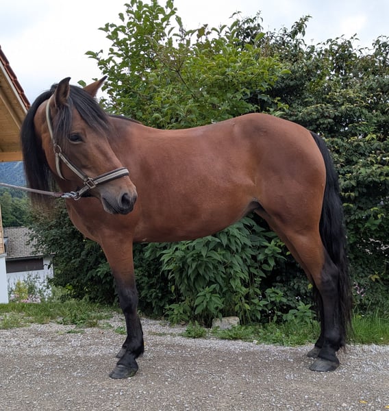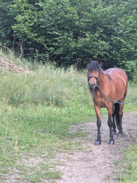 Very brave, beautiful mare, height approximately 140 cm, absolutely fearless in all situations one can imagine in road traffic and elsewhere, completely relaxed. Suitable for someone who enjoys groundwork or leisurely walks and rides at a walk. Due to ataxia, she is not suitable for higher riding demands. Otherwise, she is fit, requires no medications or treatment, is very easy to care for, and is not sensitive regarding feeding and housing. I am happy to send videos on the lunge and more photos.