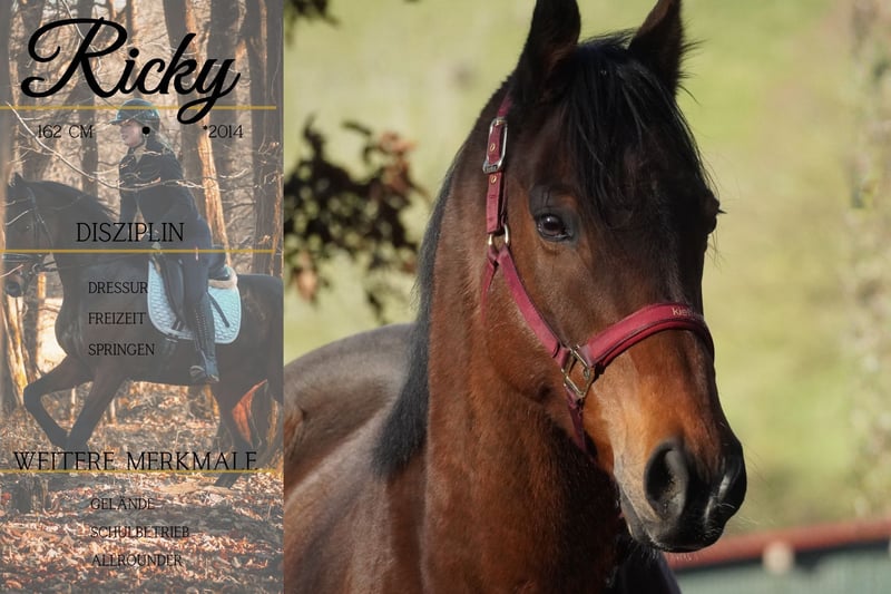 Ricky is a 2014-born gelding, approximately 16.1 hh, sired by Alkaadhem out of Green Desert. *Ricky* is a stylish all-rounder. He is suitable for both arena and trail riding, making him a fantastic leisure partner. He handles unfamiliar environments without any issues. Ricky also enjoys water crossings. !!! BE SURE TO WATCH HIS VIDEO !!! He is very gentle in handling but may be a bit cautious around strangers. He has three good gaits and a lovely, cooperative character who wants to please. You can find a current video of him here in the listing or at the following link: https://www.youtube.com/watch?v=irOK2jB1Eq0 Horse dealership Dederichs – Your partner for horse purchasing Contact & Availability: Please inquire exclusively by phone at 0173/9792139 Monday – Friday: 9:00 a.m. – 6:00 p.m. Saturday: 9:00 a.m. – 3:00 p.m. Sunday: Closed Follow us on social media! Experience our daily work with sale horses on Instagram, TikTok & Facebook under Pferdehandlung Dederichs Discount: Receive a 5% – 10% discount when taking your new dream horse immediately. Trial riding & demonstrations: • Trial ride: €30 per horse (up to 2 riders), fee will be credited upon purchase • Holidays: Trial ride €50 • Demonstration by our trainers: €25 per horse (pre-riding, groundwork, etc.) Pre-purchase examination & transport: • Many of our horses already have a health certificate (AKU) • You are welcome to bring your own veterinarian • We can organize a veterinary examination • We also assist with transport to your new home Additional sale horses: We have more horses available that are not yet listed online. If your dream horse isn't listed, please don't hesitate to contact us. Important notes: • Estimated height measurements are approximate and not precisely measured • All descriptions are subjective assessments by the seller and do not constitute guaranteed qualities