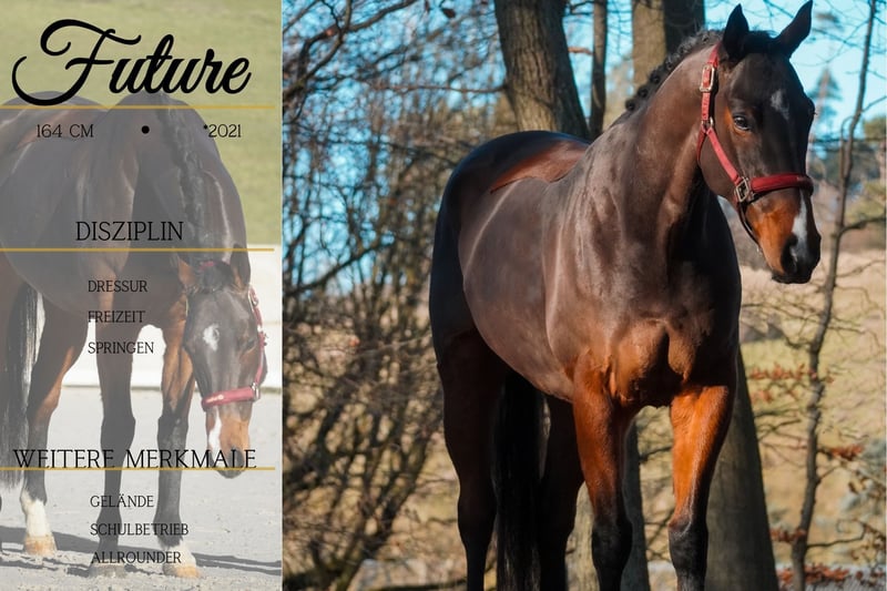 Future to koni około 1,64 m wałach po Highland Reel, Galileo x Storm Cat *Future* to niezwykle elegancki wszechstronny koń. Doskonale się prowadzi i jest przyjemny w jeździe zarówno na ujeżdżeniu, jak i w terenie. Posiada trzy piękne i wygodne zakresy ruchu. Pokazuje również radość z skoków. Doskonale radzi sobie w obcych środowiskach. Jest odpowiedni także dla nieśmiałych jeźdźców i młodzieży. W pracy z człowiekiem jest bardzo spokojny i przyjacielski. To wymarzony wałach o świetnym charakterze. Hodowla koni Dederichs – Twój partner w zakupie konia Kontakt i dostępność: Zapytania prosimy kierować wyłącznie telefonicznie pod numer 0173/9792139 Poniedziałek – piątek: 09:00 – 18:00 Sobota: 09:00 – 15:00 Niedziela: dzień wolny Śledź nas w mediach społecznościowych! Oglądaj nasze codzienne życie z końmi na Instagramie, TikToku i Facebooku pod hasłem Hodowla koni Dederichs Rabat: Przy natychmiastowym odbiorze nowego wymarzonego konia otrzymujesz rabat od 5% do 10% Test jazdy i prezentacja: • Test jazdy: 30 € za konia (max. 2 jeźdźców), kwota zostanie odliczona od ceny zakupu • Święta: jazda próbna 50 € • Prezentacja przez naszych jeźdźców: 25 € za konia (przygotowanie, praca na ziemi itp.) Badanie przedzakupowe i transport: • Wiele naszych koni posiada już badanie AKU • Oczywiście możesz zabrać własnego weterynarza • Chętnie zorganizujemy badanie • Chętnie pomożemy również w transporcie do nowego domu Inne konie na sprzedaż: W naszym stajni dostępne są również inne konie na sprzedaż, które jeszcze nie są dostępne online. Jeśli Twoje wymarzone konie jeszcze tam nie ma, nie wahaj się z nami skontaktować. Ważne informacje: • Szacunkowa wysokość: podana wartość jest orientacyjna i nie została dokładnie zmierzona • Wszystkie opisy są subiektywną oceną sprzedającego i nie stanowią gwarantowanych cech