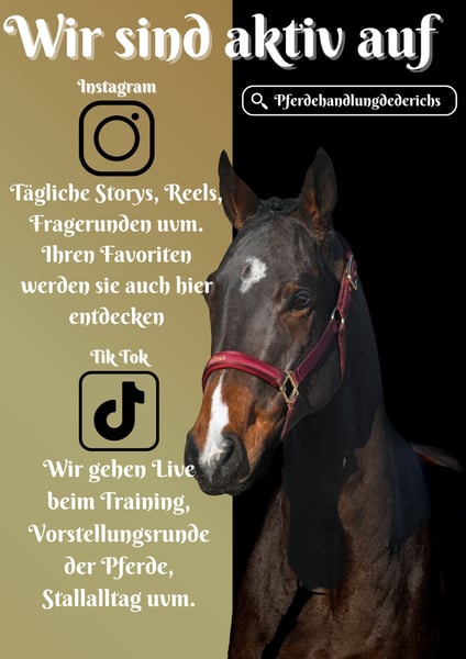 Future ist ein ca. 1,64 cm Wallach v. Highland Reel, Galileo x Storm Cat *Future* ist ein super schicker Allrounder. Super rittig und schön zu reiten in Bahn und im Gelände. Er bringt 3 schöne und bequeme GGA mit. Er zeigt auch Freude am Sprung. Fremde Umgebungen meistert er super. Er ist auch für ängstliche Reiter und Jugendliche geeignet. Im Umgang super brav und verschmust. Ein traumhafter Wallach mit super Charakter. Pferdehandlung Dederichs – Ihr Partner für den Pferdekauf Kontakt & Erreichbarkeit: Anfragen bitte ausschließlich telefonisch unter 0173/9792139 Montag – Freitag: 09:00 – 18:00 Uhr Samstag: 09:00 – 15:00 Uhr Sonntag: Ruhetag Folgen Sie uns auf Social Media! Erleben Sie unseren Alltag mit den Verkaufspferden auf Instagram, TikTok & Facebook unter Pferdehandlung Dederichs Rabatt: Bei sofortiger Mitnahme Ihres neuen Traumpferdes erhalten Sie zwischen 5 %– 10 % Rabatt Probereiten & Vorführen: • Probereiten: 30 € pro Pferd (max. 2 Reiter), Betrag wird beim Kauf angerechnet • Feiertage: Proberitt 50 € • Vorführung durch unsere Bereiter: 25 € pro Pferd (Vorreiten, Bodenarbeit etc.) Ankaufsuntersuchung & Transport: • Viele unserer Pferde besitzen bereits eine AKU • Sie können selbstverständlich Ihren eigenen Tierarzt mitbringen • Gerne organisieren wir eine Untersuchung • Wir unterstützen Sie auch gerne beim Transport ins neue Zuhause Weitere Verkaufspferde: In unserem Stall stehen weitere Verkaufspferde, die noch nicht online sind. Falls Ihr Traumpferd noch nicht dabei ist, zögern Sie nicht, uns zu kontaktieren. Wichtige Hinweise: • Stockmaß-Angaben sind geschätzt und nicht exakt nachgemessen • Alle Beschreibungen sind subjektive Einschätzungen des Verkäufers und keine zugesicherten Eigenschaften