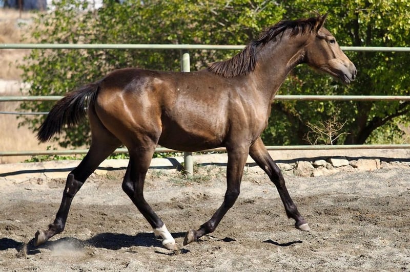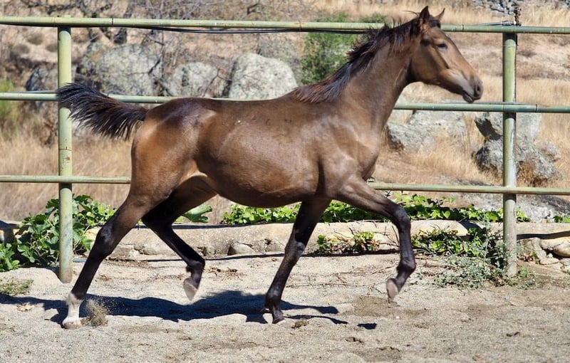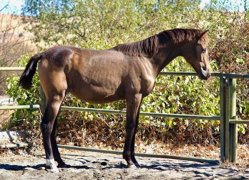 This exceptional buckskin filly, the result of a unique mix between a 1.80 m tall KWPN mother and a 1.69 m tall Spanish PRE Pearl stallion, stands out for her extraordinary movements and elegant morphology. With an impeccable physical structure, she has excellent legs and hooves, which makes her an ideal option for both dressage and other disciplines. Her genetics combine the best of two worlds: the power and height of the KWPN with the nobility and character of the PRE, ensuring a promising future for those looking for a filly with great projection and quality.
