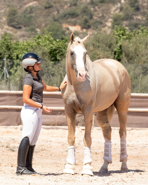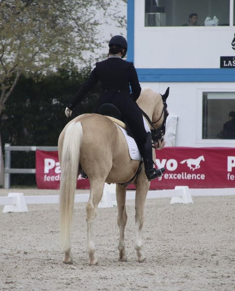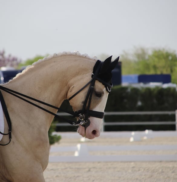 Beautiful 9 year old Palomino stallion, with confirmed St. George level and with all the Grand Prix exercises. He is a fun and very noble horse, both in the arena and outdoors.