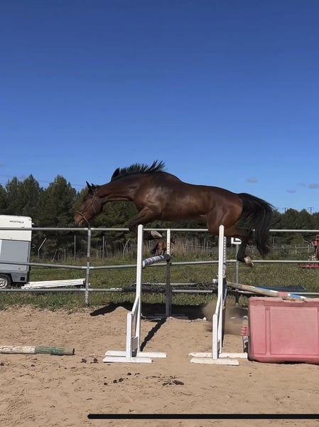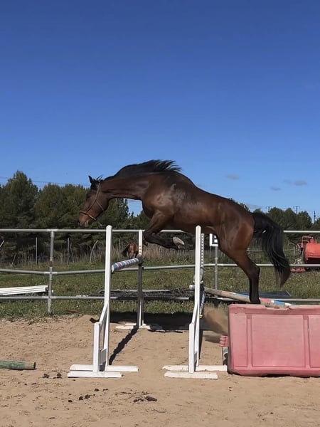 Se vende caballo CDE con 4 años cumplidos con mucha proyección para el salto. Caballo muy noble, 1.79 a la cruz pero con mucha sangre y poténcia. El potro está desbrabado y ya va montado. Se mandan videos saltando en libertad. Se valoraria cambio por yegua montada con buenos origenes de salto.