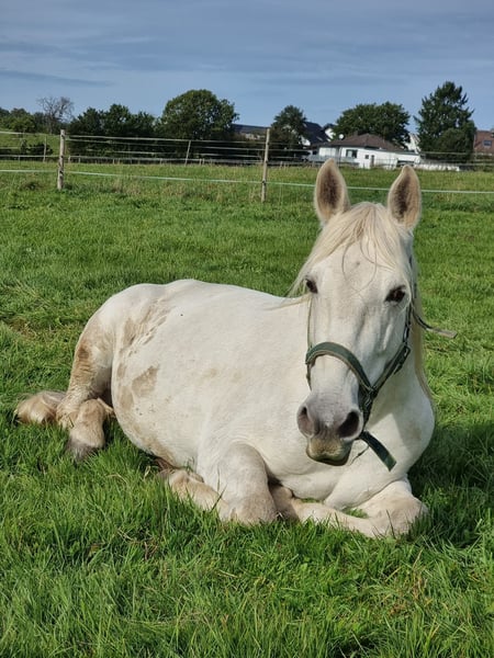 Farco, a lively Spanish-mix gelding! Born in 2016. Farco suffers from osteoarthritis in his right hind fetlock joint; light riding in walk might be possible for a very gentle rider. If he feels pain, he will run away. He is explicitly offered as a companion horse and can enjoy his life with his herd mates. He has been compatible with all horses so far, but is not a leader type. He is familiar with groundwork, horsemanship, and is very sweet and friendly. However, he is quite skittish – the wind worries him. We’ve managed to address his fears well with desensitization exercises. He is alert and curious by nature. He also goes for walks in the forest with me. Unfortunately, I cannot provide him with the security he needs (before we knew about his arthritis, he threw me off four times in canter). I love him dearly, but he is not doing well with me! For health reasons, I can no longer meet his needs. Additionally, the mare he was kept with has passed away, and he now lacks the security she provided. Our current paddock is very windy, which causes him additional stress. We are looking for a paddock life in an open stable. Space is more important than price!