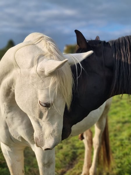 Farco, un mâle espagnol-mix plein de vie ! Né en 2016. Farco souffre d’arthrose dans l’articulation du jarret arrière droit, il pourrait peut-être être monté en pas léger par une personne très douce. S'il a mal, il s’enfuit. Il est expressément proposé comme cheval de compagnie et peut profiter de sa vie avec des copains. Jusqu’à présent, il s’est montré compatible avec tous, plutôt pas dominant. Il connaît le travail à la longe, le travail en liberté, il est très gentil et amical. Mais il est aussi très craintif – le vent l’effraie. Nous avons réussi à bien gérer cela avec des exercices de désensibilisation. Il a l’esprit vif et curieux. Il se promène aussi avec moi en forêt. Malheureusement, je ne peux pas lui offrir la sécurité dont il a besoin (avant de découvrir son arthrose, il m’a déjà fait tomber en galop à quatre reprises). Je l’aime plus que tout, mais il ne va pas bien chez moi ! Pour des raisons de santé, je ne peux plus lui apporter ce dont il a besoin. De plus, la jument qui était avec lui est décédée, il lui manquera la sécurité qu’elle lui apportait. Notre emplacement actuel est aussi très venteux, ce qui lui cause encore plus de stress. Nous recherchons un hébergement en paddock-box ou en pâture. La priorité est l’espace, le prix est secondaire !