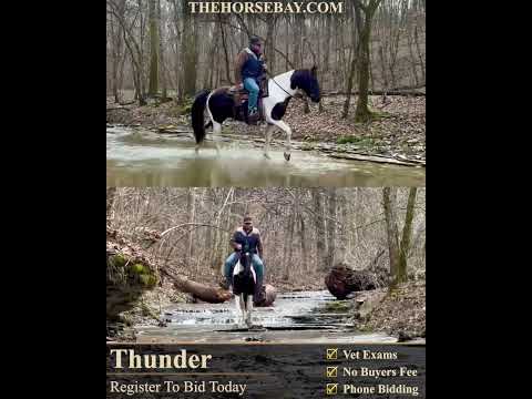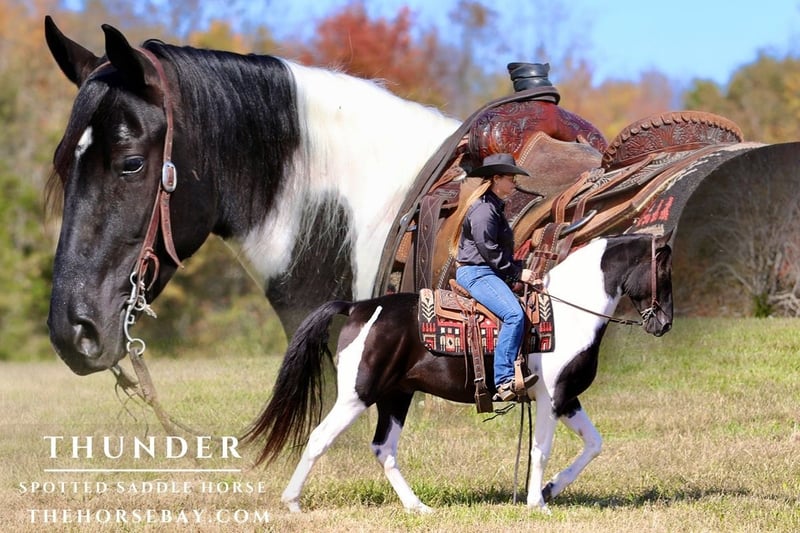 Thunder is a beautiful black and white spotted saddle horse gelding. He stands 15.1 hands tall and has a very nice conformation. He is well put together, and his color is gorgeous. We have owned him for a year now, and he is a great all-around horse. He has a smooth, all-natural gait that is fun and easy to ride. He is shod now, but he can go barefoot as he has good, strong feet. Thunder trails great, and we have taken him over all types of terrain. He crosses water, logs, and ditches, and will go anywhere you ask him. He is also safe along the highway with traffic and has been ridden to town many times. Thunder is responsive to your cues and a fun horse to ride. He is a gentle horse but also has enough motor to get you where you need to go. He has even been hunted off and used to check cattle. Thunder is a great all-around horse that has a load of experience and is ready for whatever job you throw at him! Feel free to call! Shipping can be arranged anywhere in the US.