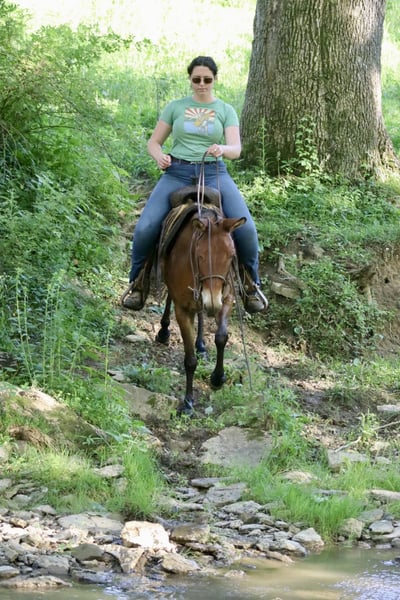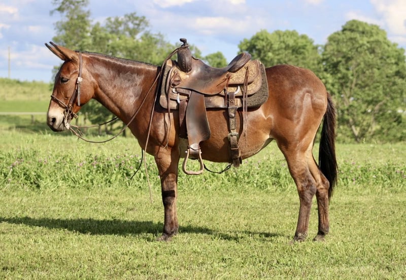 ONLINE AUCTION Place your bids at www.PlatinumEquineAuction.com Starting Bid $3500 Auction ends June 23rd, 2024 Need a new saddle? Check out White Rock Saddles on our website or Facebook! Josie is a 14.1 hand, 13 year old gaited molly mule. She is a super sweet and honest mule that the whole family loves! Don’t let her height fool you, she is stocky made and carries her rider well. She is very solid on the trails. She is careful and sure footed. Rides confidently on various terrain and crosses natural obstacles with ease. She is a smooth ride and has the best ear flopping walk you can find! She rides with the group well. Whether it’s leading, in the middle, or behind, she is happy to ride wherever. If you want to ride out alone, she does that quietly and confidently as well. She will happily walk away from the trailer with other horses/mules left behind and not cause a fuss. Josie is quiet and gentle when kids want to mess with her. She nicely lets them lead her, ride her, and climb all over her! We have trail ridden her double with our toddlers riding with us. She is traffic safe, and we have ridden her around farm equipment working with no issues. She picks up her feet nicely. Stands for saddling and mounting. Travels well. She’s been on countless overnight camping trips. Josie is a special mule that anyone is sure to love and enjoy! For more information, call Waugh Livestock Sammi 704-798-5497 Located in Brooksville, KY. ONLINE AUCTION Place your bids at www.PlatinumEquineAuction.com Starting Bid $3500 Auction ends June 23rd, 2024 Need a new saddle? Check out White Rock Saddles on our website or Facebook!