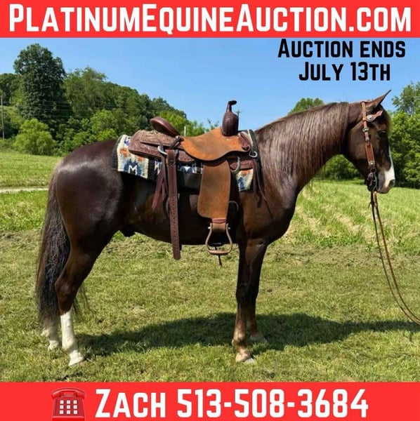 ONLINE AUCTION Place your bids at www.PlatinumEquineAuction.com Starting Bid $3500 Auction ends July 13th 2025 Need a new saddle? Check out White Rock Saddles on our website or Facebook! Mister Johnny Ringo, barn name Ringo is a gorgeous 6 year old reg twh gaited gelding standing 15.1 hands tall. Ringo is a seasoned trail horse with a smooth gait and an easy to enjoy attitude. Ringo is peaceful out on the trail and always aims to please his person, he is self confident, relaxing and easy to operate. Ringo is sure footed no matter the terrain and doesn’t shy from traffic. He goes where you point his head with out hesitation. Ringo is a beautiful horse with great structure and build. Located in Moscow, OH. Contact Brandenburg Stables Zach 513-508-3684 with any questions, to make a Buy It Now Offer or to schedule a visit. ONLINE AUCTION Place your bids at www.PlatinumEquineAuction.com Starting Bid $3500 Auction ends July 13th 2025 Need a new saddle? Check out White Rock Saddles on our website or Facebook!