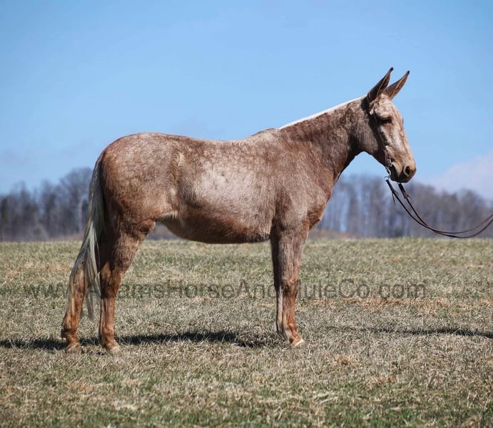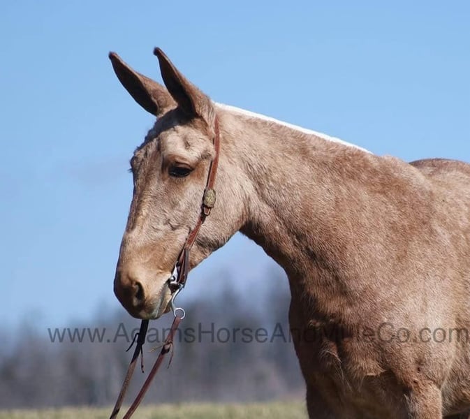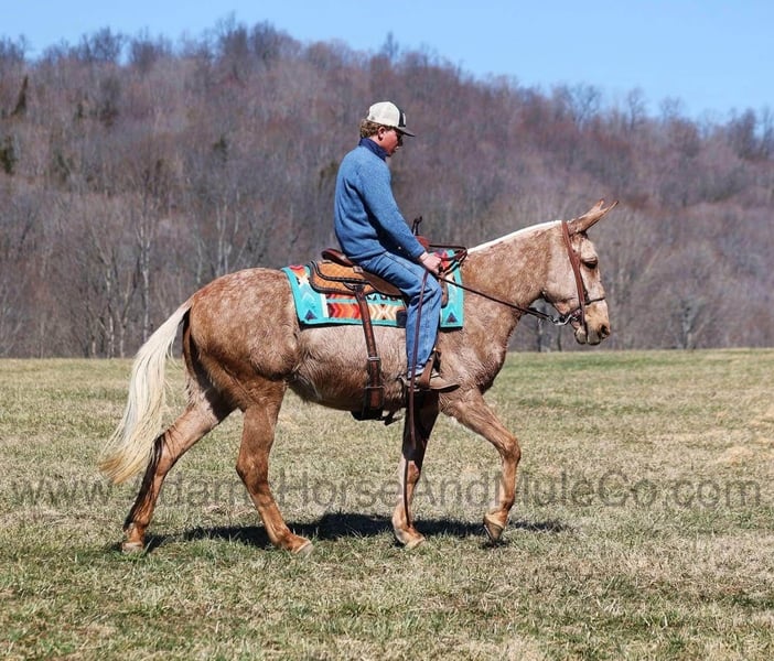 Visit our website for more pics and a video. AHAMC has been in the horse business and sold horses over the internet since 2005. We have a long track record of success with hundreds of happy customers. We work hard to match riders with the correct horses and specialize in beginner safe, family friendly horses that have been used and checked out by our family! We can set up transportation anywhere in the US and look forward to working with you. Minnie Pearl is an attention getting Golden Palomino Molly Mule with dapples all over and a white Mane and Tail. She stands right between 15.1 and 15.2H and is stocky built. Pearl is as naturally gaited as they come and gaits on a loose rein for a ride that is comfortable for hours in the saddle. She is perfectly fine with her ears and feet and is not quirky. Pearl has been trail ridden in multiple states and is good on trails. She will cross any obstacle and goes over any terrain. She has been exposed to all kinds of wildlife such as deer or turkey and will go anywhere that she is asked too. She has been rode many miles in the mountains and encountered every obstacle possible on the trail. She will go up or down even the steepest slopes, across deep creeks, over downed trees, and over all types of rough terrain while still being sure footed. She has been rode in traffic, and is very traffic safe around cars, semi, log, and dump trucks. She has a great attitude about whatever she is asked to do. Feel free to call Eric 606-308-2461 with any questions. visit our website for more pics and a video. AHAMC has been in the horse business and sold horses over the internet since 2005. We have a long track record of success with hundreds of happy customers. We work hard to match riders with the correct horses and specialize in beginner safe, family friendly horses that have been used and checked out by our family! We can set up transportation anywhere in the US and look forward to working with you.