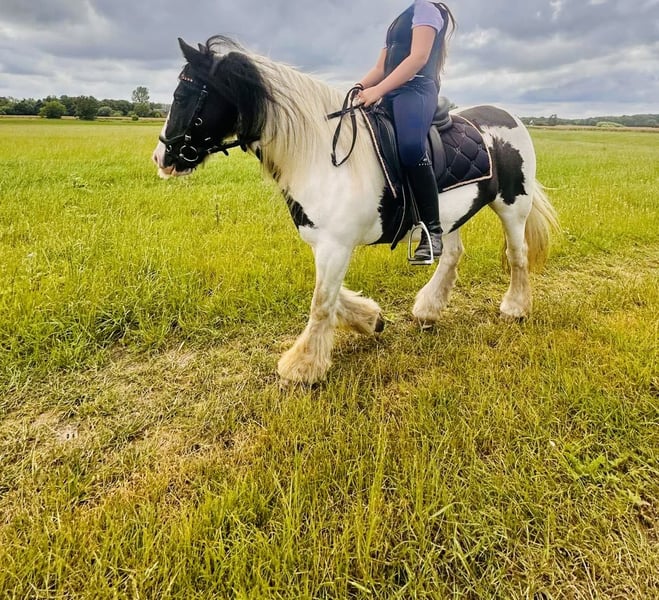 Wir suchen für unser Tinker-Pony Rainbow, genannt „Tinki“, ein liebevolles Zuhause. Tinki ist 15 Jahre alt, ca. 1,35 m groß und deckt aufgrund ihres stabilen Körperbaus gut ab. Tinki ist regelmäßig geimpft und entwurmt, verlade- und schmiedefromm und läuft barhuf. Bei uns steht sie nachts in der Box, wir können sie uns aber auch in Offenstallhaltung gut vorstellen. Krankheiten sind uns keine bekannt und in den Jahren, die sie bei uns ist, gab es keine gesundheitlichen Probleme. Rassetypisch hat Tinki gelegentlich leicht Mauke, was mit regelmäßiger Pflege des Behangs gut zu behandeln ist. Fütterungstechnisch ist Tinki unkompliziert. Sie bekommt hauptsächlich Heu und etwas Müsli und Mineral gefüttert. Tinki ist ein intelligentes, liebenswertes und aufgewecktes Pony, das gefördert, ausgelastet und beschäftigt werden möchte und eine konsequente Bezugsperson braucht. Sie hat ein sehr freundliches und liebes Wesen, testet gelegentlich allerdings in „Ponymanier“ ihre Grenzen, sodass sie nur bedingt für bloße Reitanfänger geeignet ist. Bei uns wurde Tinki hauptsächlich beim Ponyführen und beim Hippolini mit kleinen Kindern, bei der Bodenarbeit sowie im Reitunterricht eingesetzt und zeigte sich auch beim Stangentraining oder an kleineren Sprüngen geschickt und talentiert. Bei ihren Vorbesitzern hat Tinki an Führzügelwettbewerben teilgenommen und auch beim Ponyreiten auf Kinder-/Dorffesten ist Tinki ein verlässlicher Partner. Tinki wird mit Trense und Sattel (im Preis inklusive) verkauft. Wir geben sie nur in allerbeste Hände ab, da sie bei uns leider mental und körperlich nicht ausgelastet ist und wir ihr insoweit nicht gerecht werden können. Für weitere Fragen und Videos meldet Euch gerne bei uns. 4000€ inklusive Sattel und Trense