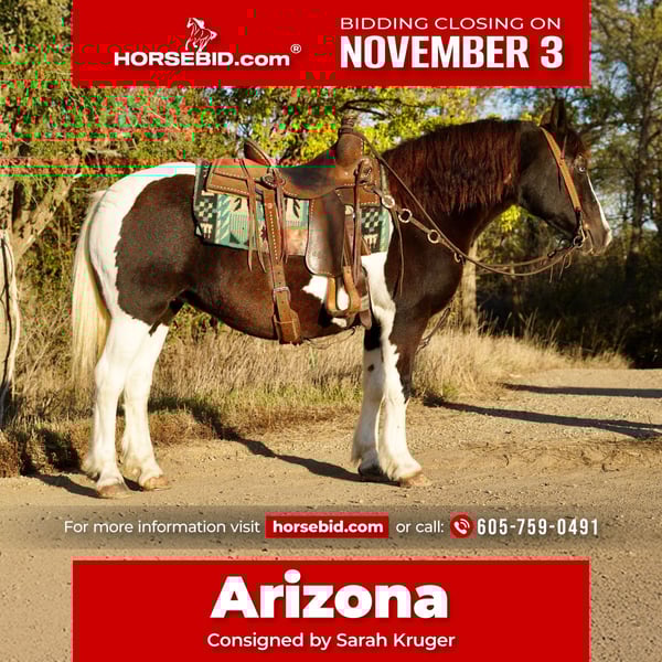 ⚜️𝐓𝐇𝐄 𝐅𝐀𝐋𝐋 𝐇𝐄𝐑𝐈𝐓𝐀𝐆𝐄 𝐂𝐋𝐀𝐒𝐒𝐈𝐂⚜️ Happening now thru MONDAY | NOVEMBER 3rd - Available EXCLUSIVELY on HorseBid's website! For more details and to register visit: www.Horsebid.com CONSIGNOR CONTACT: Sarah Kruger (605) 759-0491 LOCATION: Brandon SD BREED: Gypsy Vanner Pony Cross REGISTERED: No REGISTERED NAME: Arizona COLOR: Paint HEIGHT: 14 AGE: 15 GENDER: Mare Arizona is a very fancy 15 year old 14 hand half Gypsy pony cross mare, Arizona is as cute as they come and GENTLE AS THEY COME, she is broke to ride and drive been used by Amish family for many years, she is super easy to handle and ride loves attention, super easy keeper 100% sound and super fun to ride. She is traffic safe great down the trails and around the farm, she is good with other horses, used to kids climbing all over and under her. Call or text Sarah Kruger (605) 759-0491