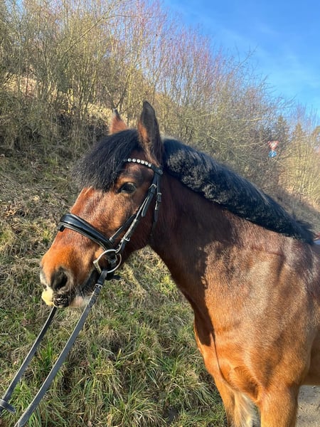 A very sweet mare is looking for her forever home! I am hoping to find someone who can offer her the best life with patience and calmness. She is very gentle in handling, knows no bad habits, and is easy to manage with both the farrier and the veterinarian. She is familiar with trailer loading, although she still needs some practice. She requires a trusting handler, as she is initially somewhat shy and sensitive. However, she blossoms with time. Her favorite activity is hacking out; she can even go on a canter! But she also enjoys long walks at a relaxed pace to unwind and enjoy the scenery. Arena work was a foreign concept to her at first, but we have gradually learned the basics, and she always wants to do her best, showing herself to be a clever little mare. I believe she could learn much more with the right person! She enjoys free jumping, lunging, and long-lining, listening well to voice commands. Of course, she can also sometimes get a bit spirited and give a little gas. Therefore, I am looking for an experienced horse person, as she is still a small, sensitive pony mare with her own head—never malicious. Clear rules and boundaries should be established, or she might try to take control herself. Regarding mud fever: She came to me with mud fever but is now in excellent condition. We have always consulted with the veterinarian. She is vaccinated, has had regular blood tests, and shows no signs of injuries. It’s difficult for me because we have achieved a lot together and learned from each other, but I am only about 1.70 meters tall, and my weight is no longer sustainable for her. Plus, she’s simply too nice to be sold off. If you’re interested, please don’t hesitate to get in touch!