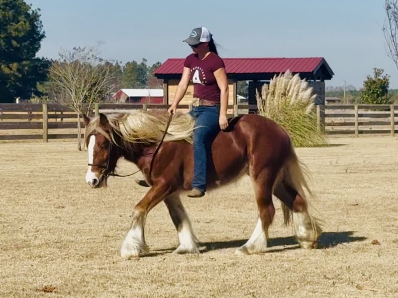 ⚜️𝐓𝐇𝐄 𝓗𝓮𝓻𝓲𝓽𝓪𝓰𝓮 𝐖𝐢𝐧𝐭𝐞𝐫 𝓒𝓵𝓪𝓼𝓼𝓲𝓬⚜️ Happening now thru MONDAY | DECEMBER 29th - Available EXCLUSIVELY on HorseBid's website! For more details and to register visit: www.Horsebid.com CONSIGNOR CONTACT: Windmill Equine 860-250-9120 LOCATION: Johnston, SC BREED: Gypsy Vanner REGISTERED: No COLOR: Chestnut HEIGHT: 13.3 AGE: 3 GENDER: Mare Eve is a 3yo 13.3h Gypsy Vanner mare. Now don’t let her age fool you, she is 3 going on 13. She is unique and different and definitely something we do not get in very often, but this girl is so so special. In the barn she is quiet and respectful. She is easy to catch, groom, bathe, clip and saddle. In the ring she is probably the best riding horse you will find. She had a slow and correct start. She has gone through all the motions with all types of flat work. She has three super super easy and very comfortable gaits. She is super light in the bridle and will even come around to the bridle like a show horse. She has a great whoa, easy neck rein and she moves off your leg easy too. She has just been started over fences and is jumping cross rails easily and willingly. Her changes are started and coming along nicely too. Out of the ring she rides like your best trail horse. She leads the way, she follows, she takes charge in the scariest situations. She is dog and traffic safe and she crosses bridges and jumps logs. She is so brave and truly nothing phases her. We know she drives, but we do not have a harness or cart to try. We cannot say enough good things about this girl, she is definitely the entire package. She is still growing too so she will get taller and wider. She has no blemishes, no vices, no behavioral issues, she is truly perfect in every way. Whoever ends up with her will for sure have one of the best, most eye catching horses wherever they go.